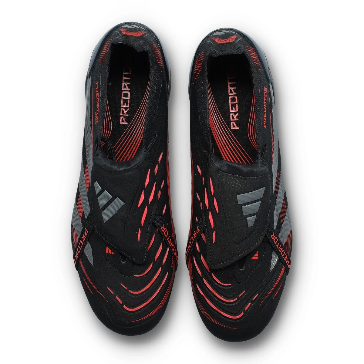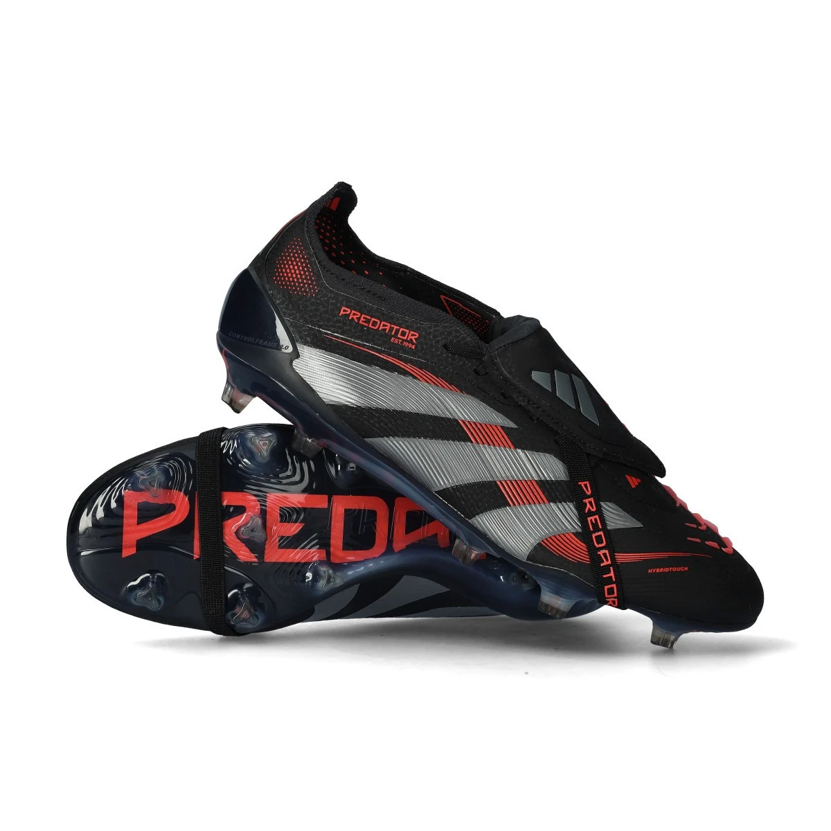 Chaussures de football adidas Predator Elite FT FG pour adultes. Chaussures synthétiques à lacets pour utilisation sur terrains en gazon naturel. Chaussures haut de gamme en couleur Core Black-Grey Four-Lucid Red.