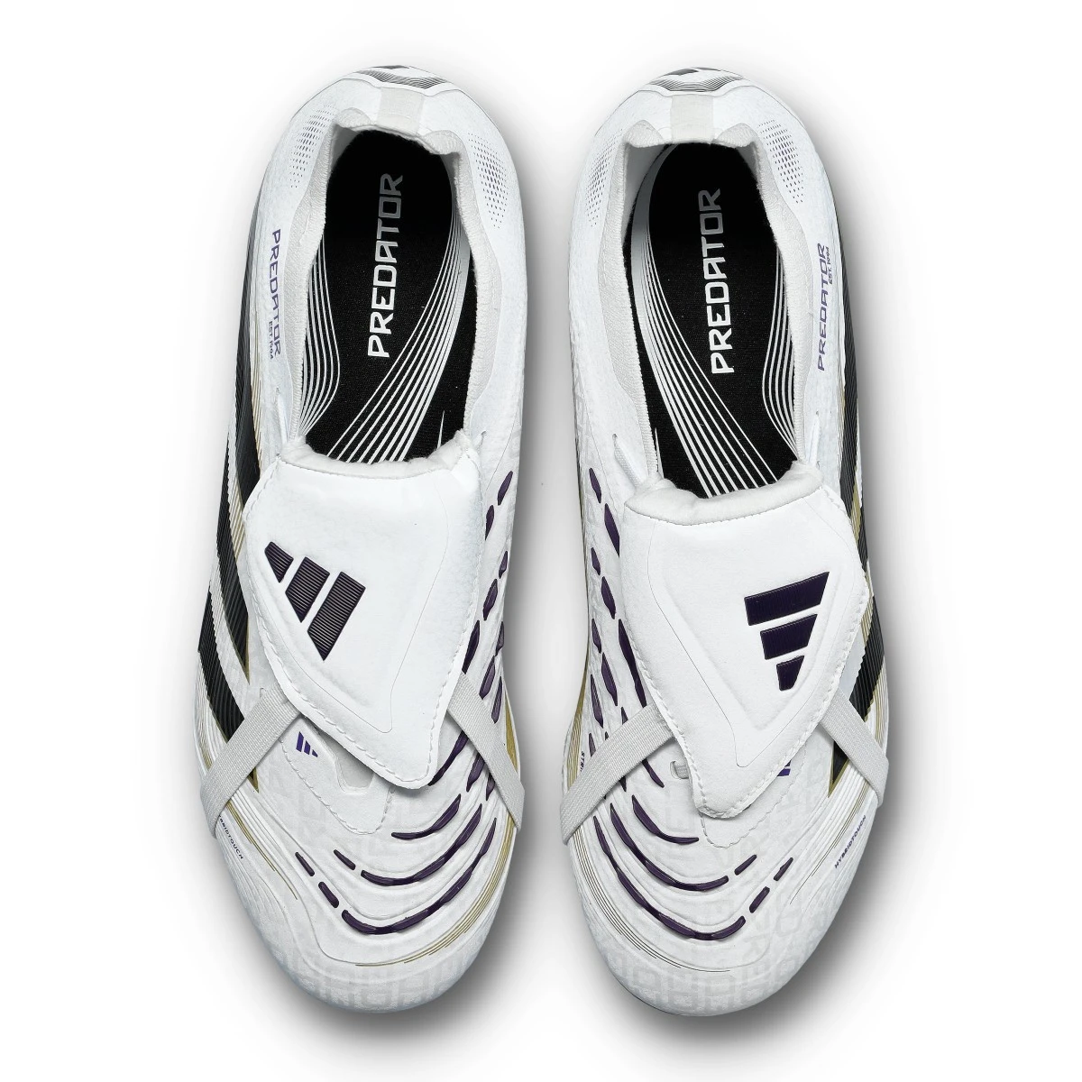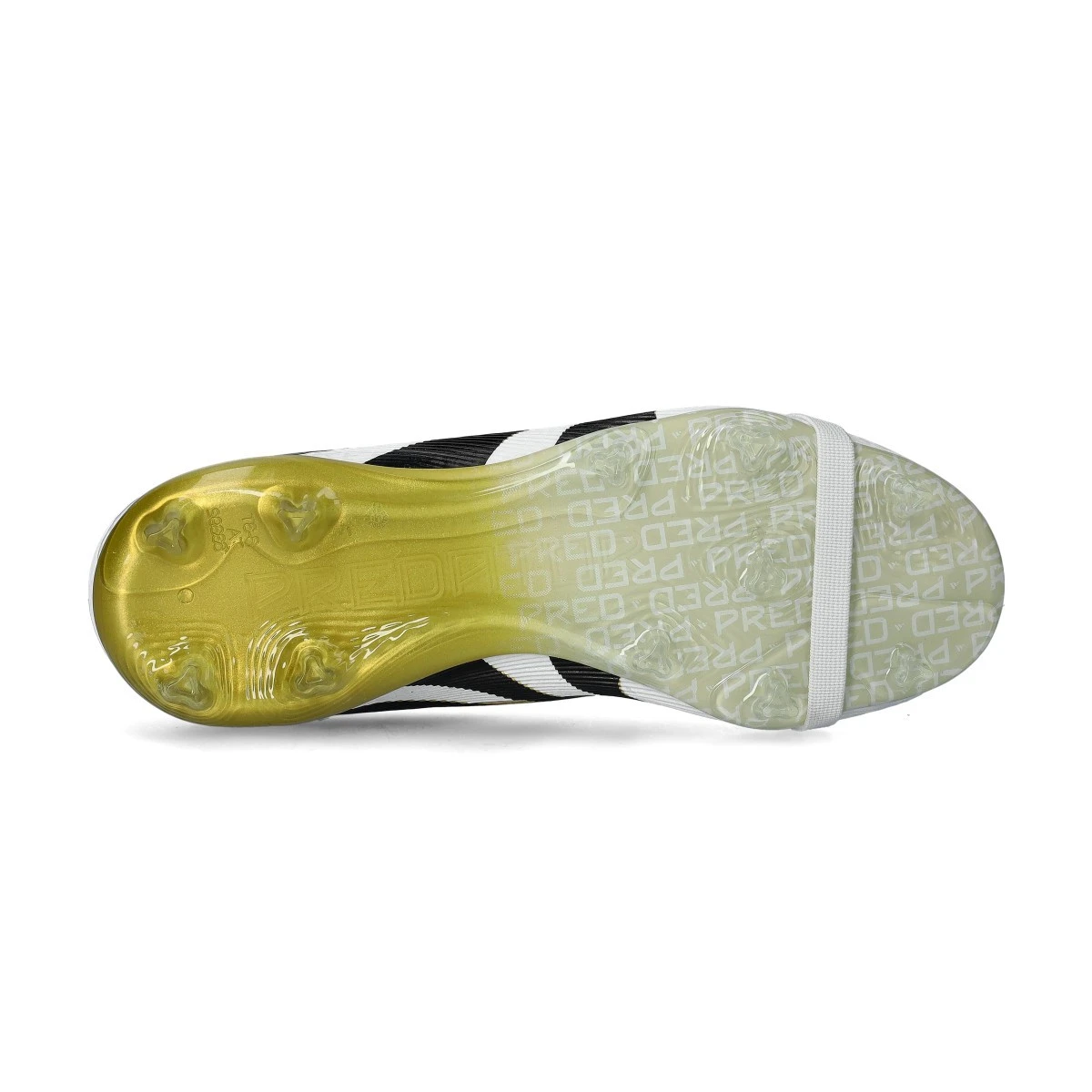 Chaussures de football adidas Predator Elite FT FG pour garçons. Chaussures synthétiques à lacets pour utilisation sur terrains en gazon naturel. Chaussures haut de gamme en White-Core Black-Gold Met.