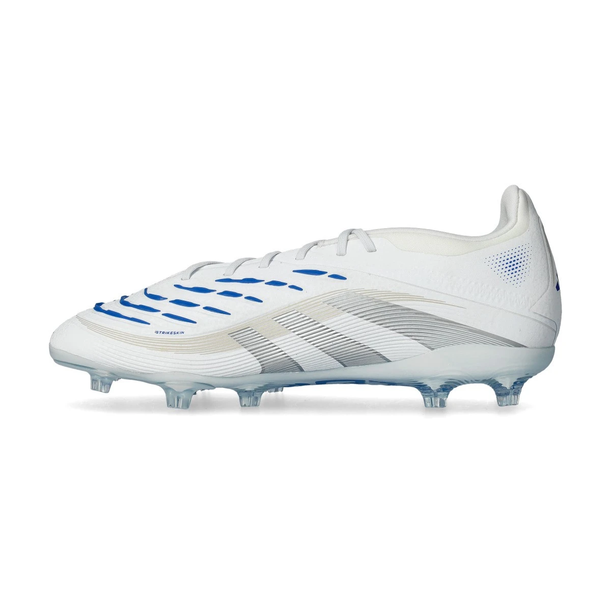 Chaussures de football adidas Predator Elite L FG pour enfants. Chaussures synthétiques à lacets pour utilisation sur terrains en gazon naturel. Chaussures haut de gamme en Ftwr White-Silver Met-Bright Royal.