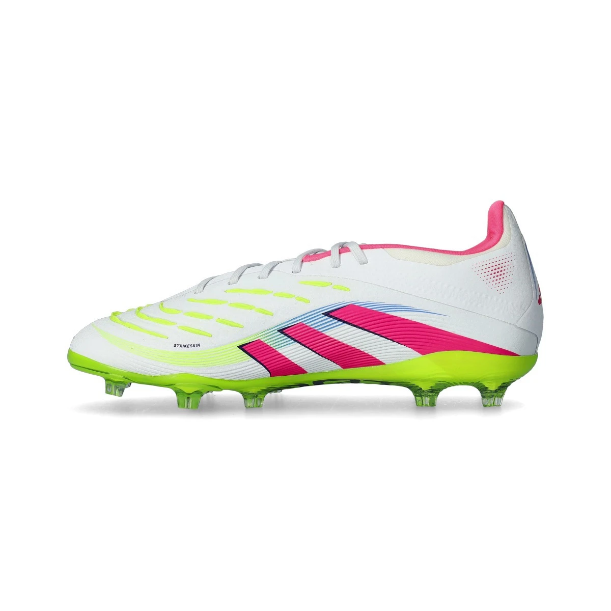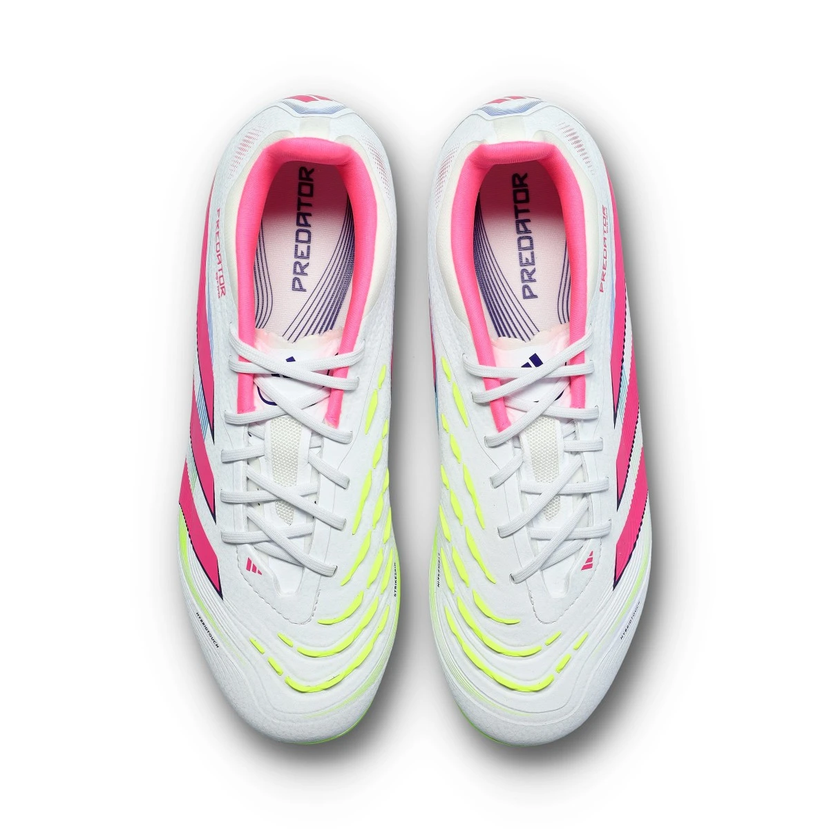 Chaussures de football adidas Predator Elite L FG pour enfants. Chaussures synthétiques avec lacets pour utilisation sur terrains en gazon naturel. Chaussures haut de gamme en White-Lucid Pink-Lucid Lemon.