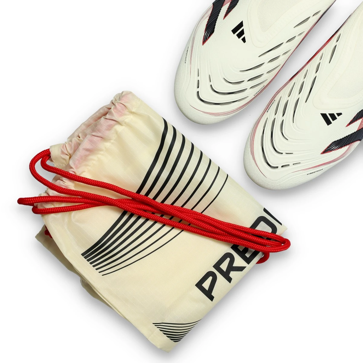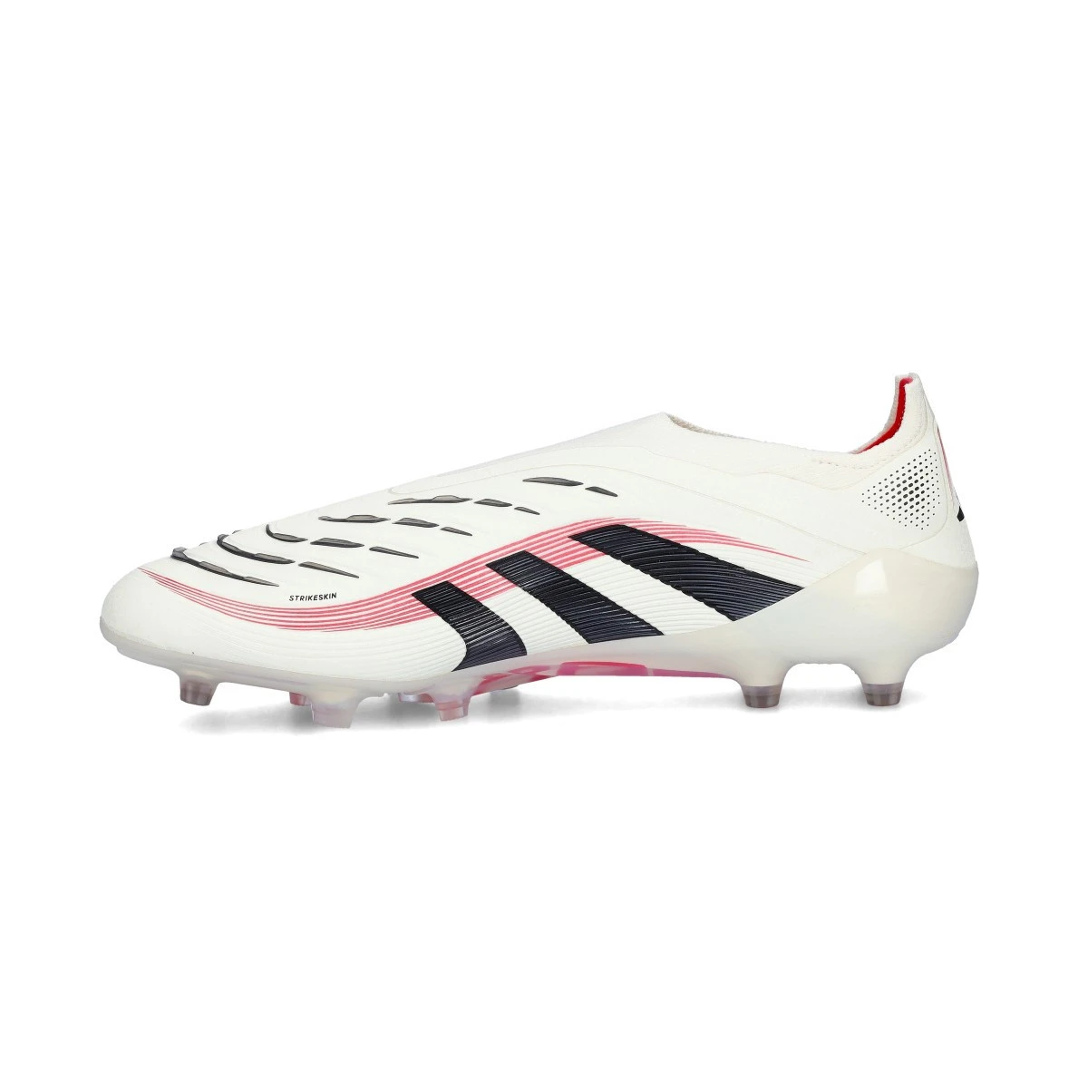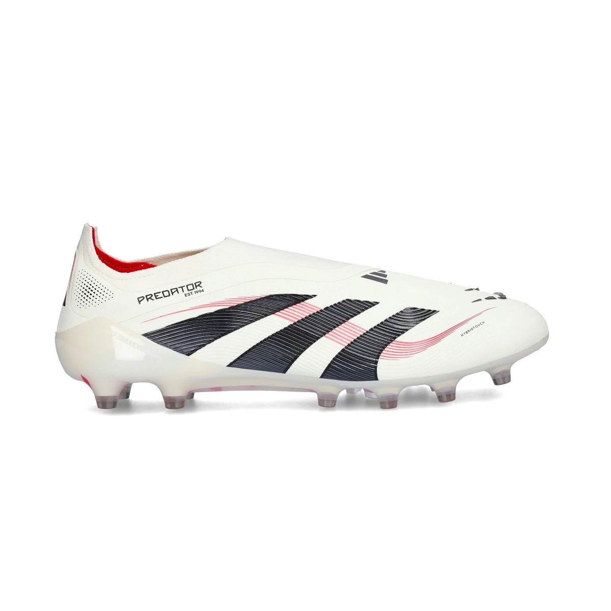 Chaussures Predator Elite LL AG d'adidas en Off White-Core Black-Pure Ruby. Modèles haut de gamme sans lacets pour les terrains en gazon artificiel.