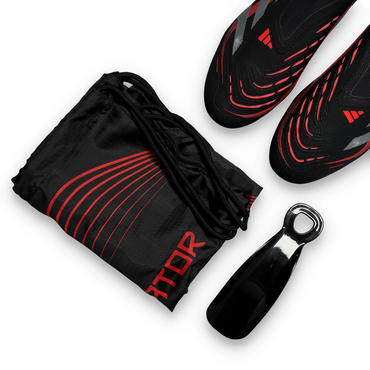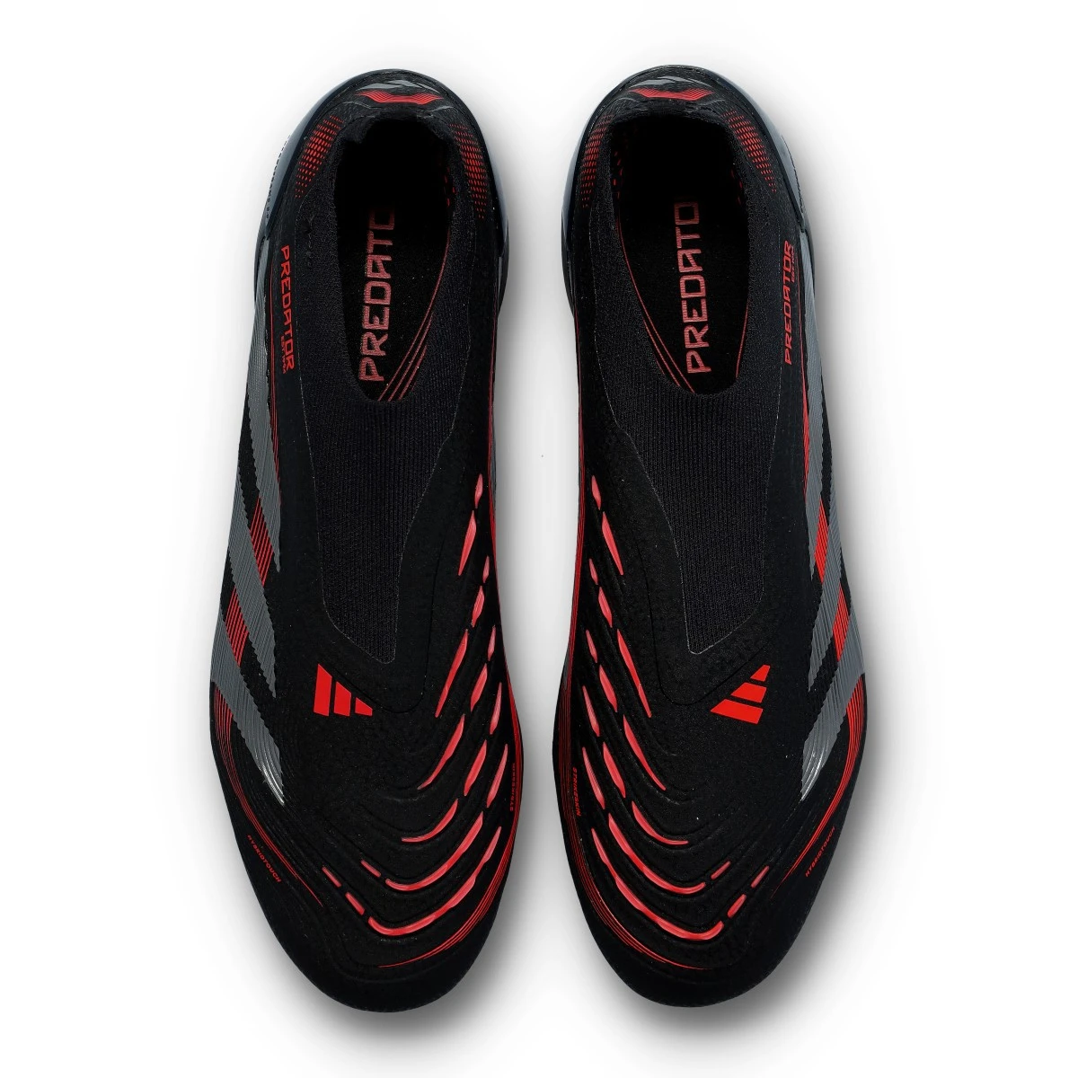 Chaussures de football adidas Predator Elite LL FG pour adultes. Chaussures synthétiques sans lacets pour utilisation sur terrains en gazon naturel. Chaussures haut de gamme en couleur Core Black-Grey Four-Lucid Red.
