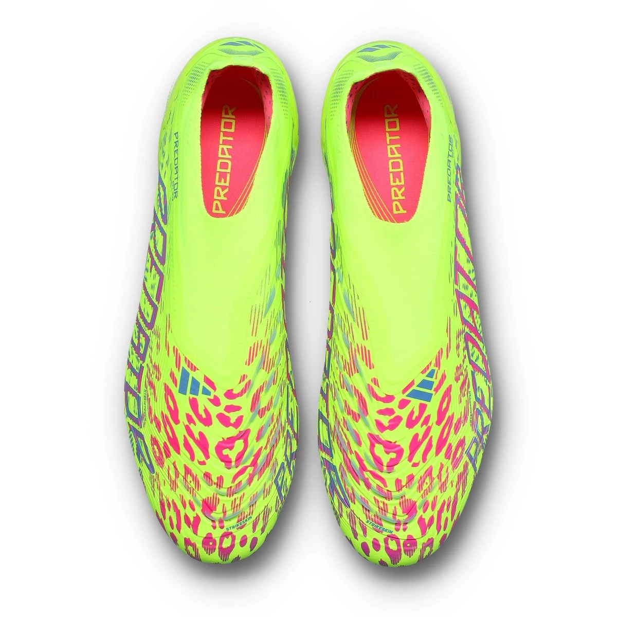Chaussures de football adidas Predator Elite LL FG pour adultes. Chaussures synthétiques sans lacets pour utilisation sur terrains en gazon naturel. Chaussures haut de gamme en coloris Lucid Lemon-Lucid Pink-Blue Fusion.