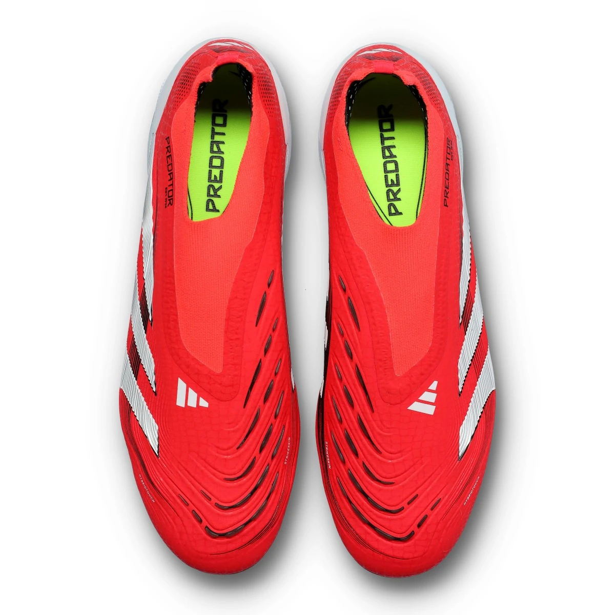 Chaussures Predator Elite LL FG d'adidas en Lucid Red-White-Core Black. Ces chaussures sans lacets sont conçues pour les terrains en gazon naturel.