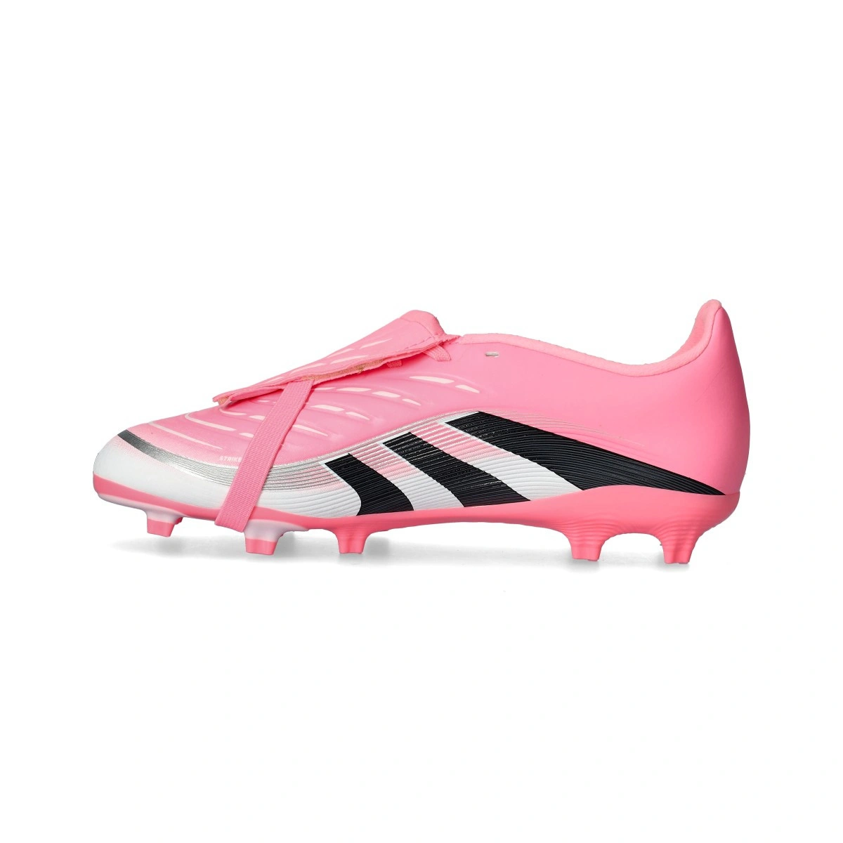 Chaussures de football adidas Predator League FT FG/MG pour enfant. Chaussures synthétiques à lacets conçues pour jouer sur terrains en herbe naturelle et sur terrains artificiels de deuxième génération. Chaussures de gamme moyenne en coloris Beam Pink-Core Black-White.