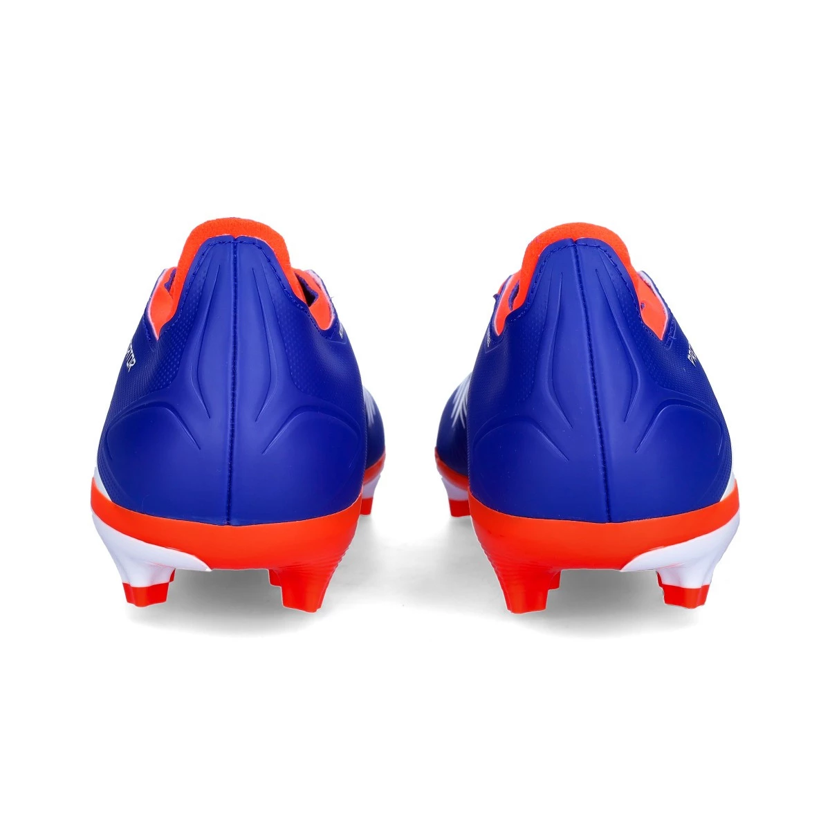 Chaussures de foot adidas F50 Predator League FG. Chaussures synthétiques à lacets à utiliser sur terrains de gazon naturel. Chaussures basse de gamme en couleur Lucid Blue-White-Solar Red.