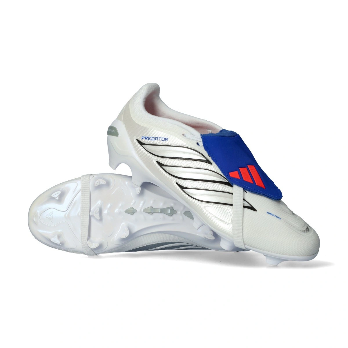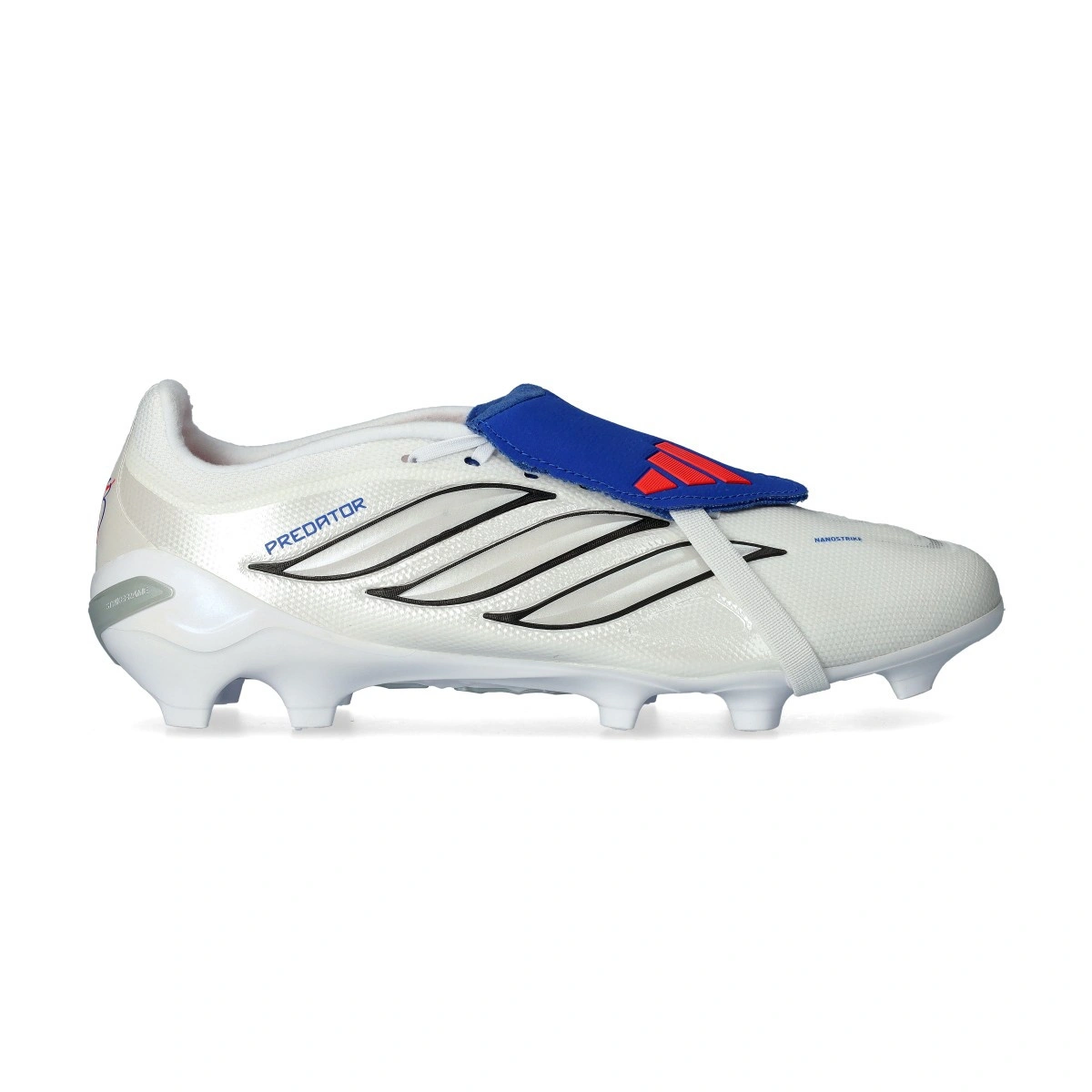 Chaussure de football adidas Predator League FT FG pour adultes. Chaussures synthétiques avec lacets à utiliser sur terrains en herbe naturelle. Chaussures d'entrée de gamme en couleur White-Zero Met-Team Royal Blue.