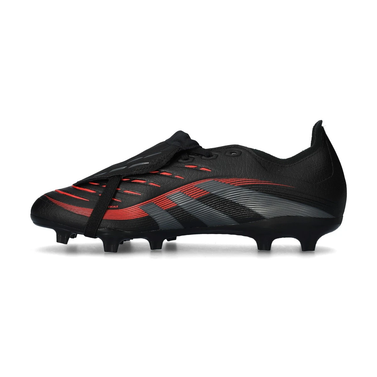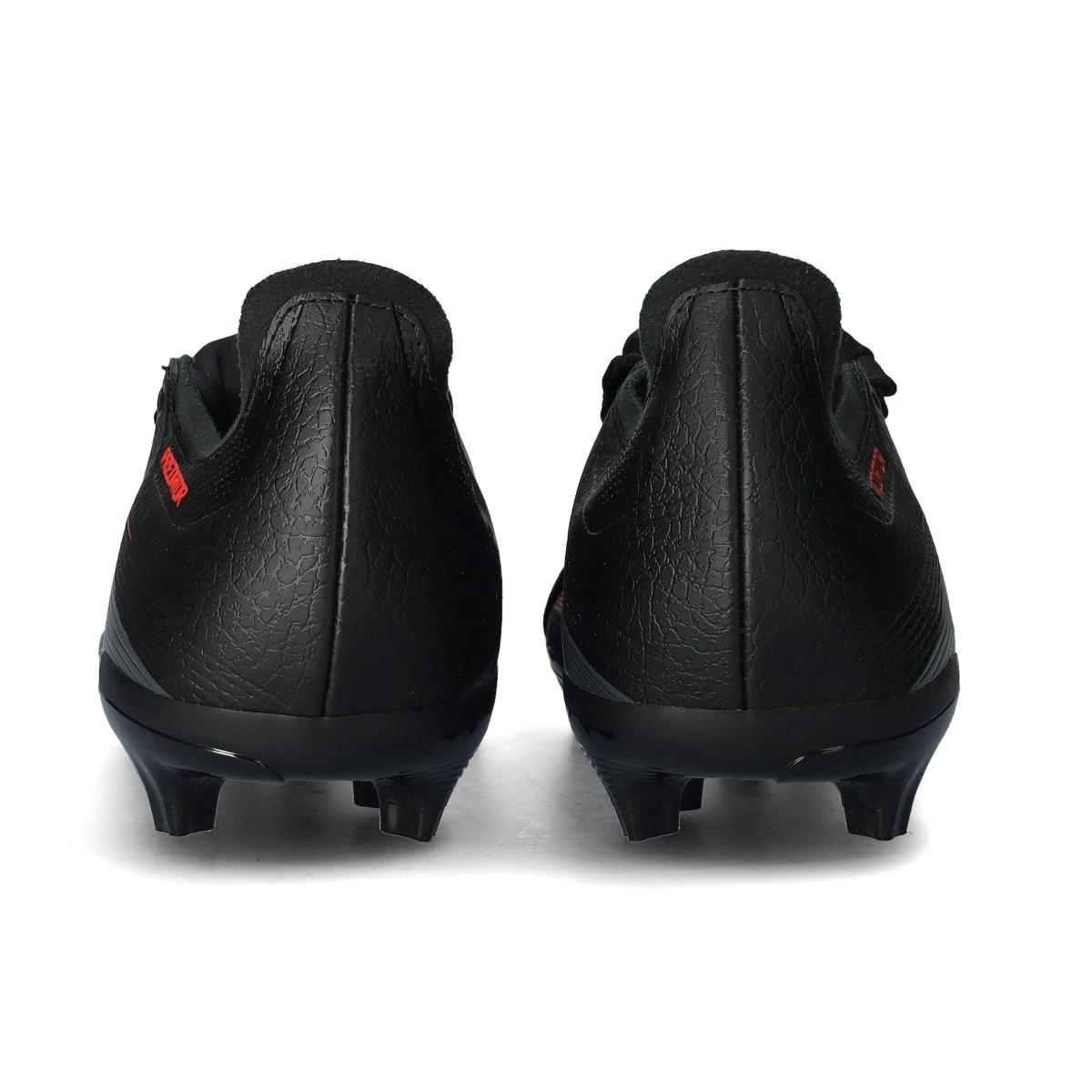 Chaussures de football adidas Predator League FT FG/MG pour adultes. Chaussures synthétiques avec lacets pour utilisation sur terrains en gazon naturel. Chaussures de milieu de gamme en couleur Core Black-Grey Four-Lucid Red.