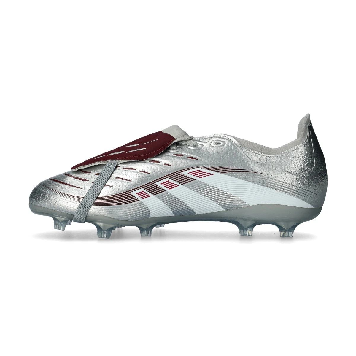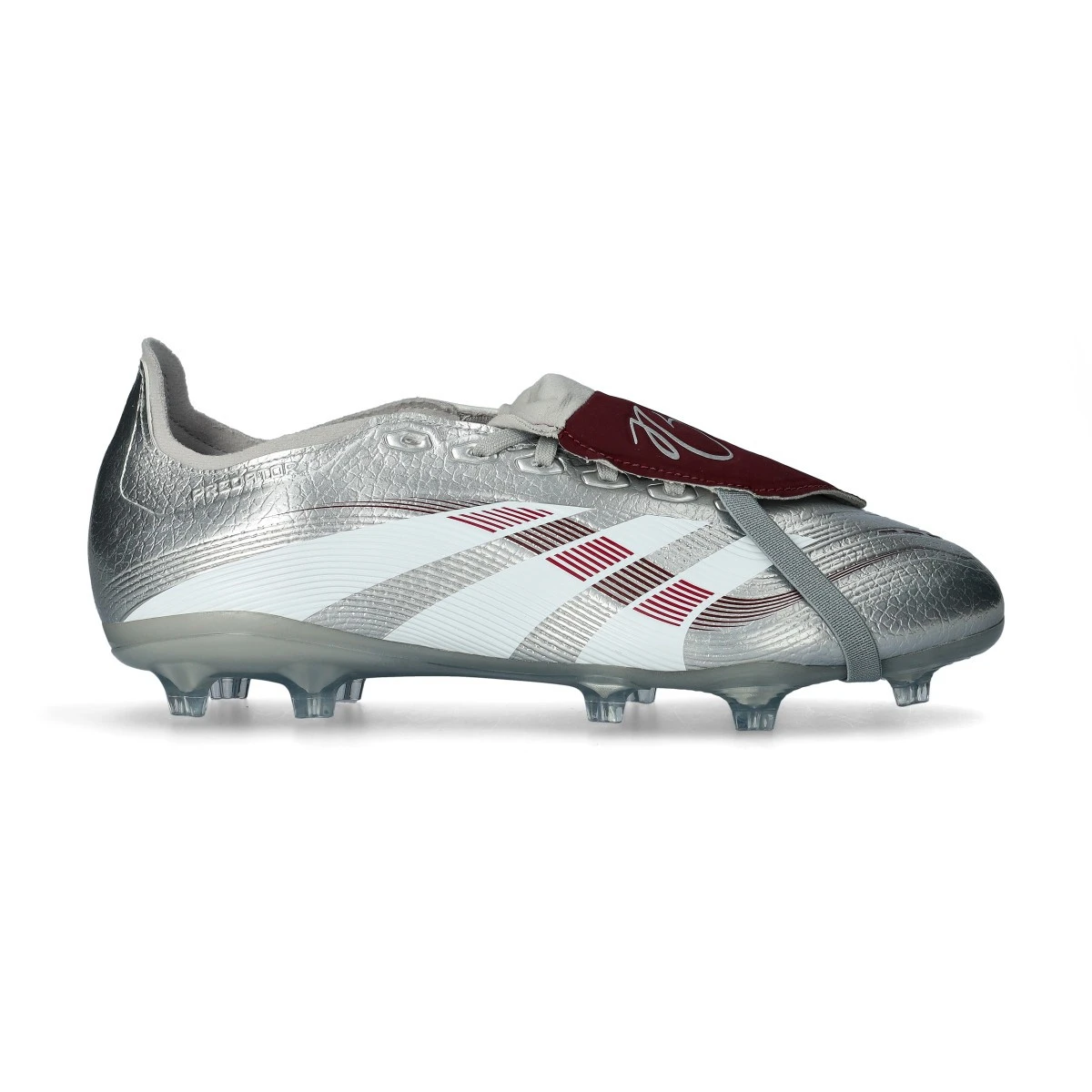 Chaussures de football adidas Predator League FT FG Jude Bellingham. Chaussures synthétiques avec languette pour utilisation sur terrains en gazon naturel. Chaussures de milieu de gamme en couleur Silver Met-Legacy Burgundy-Maroon.