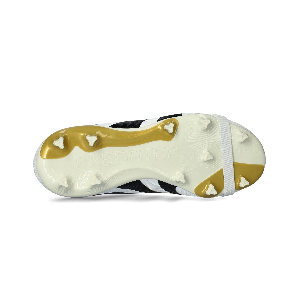 Chaussures de football adidas Predator League FT FG/MG pour enfants. Chaussures synthétiques avec lacets pour utilisation sur terrains en gazon naturel. Chaussures de milieu de gamme en Ftwr White-Core Black-Gold Met.