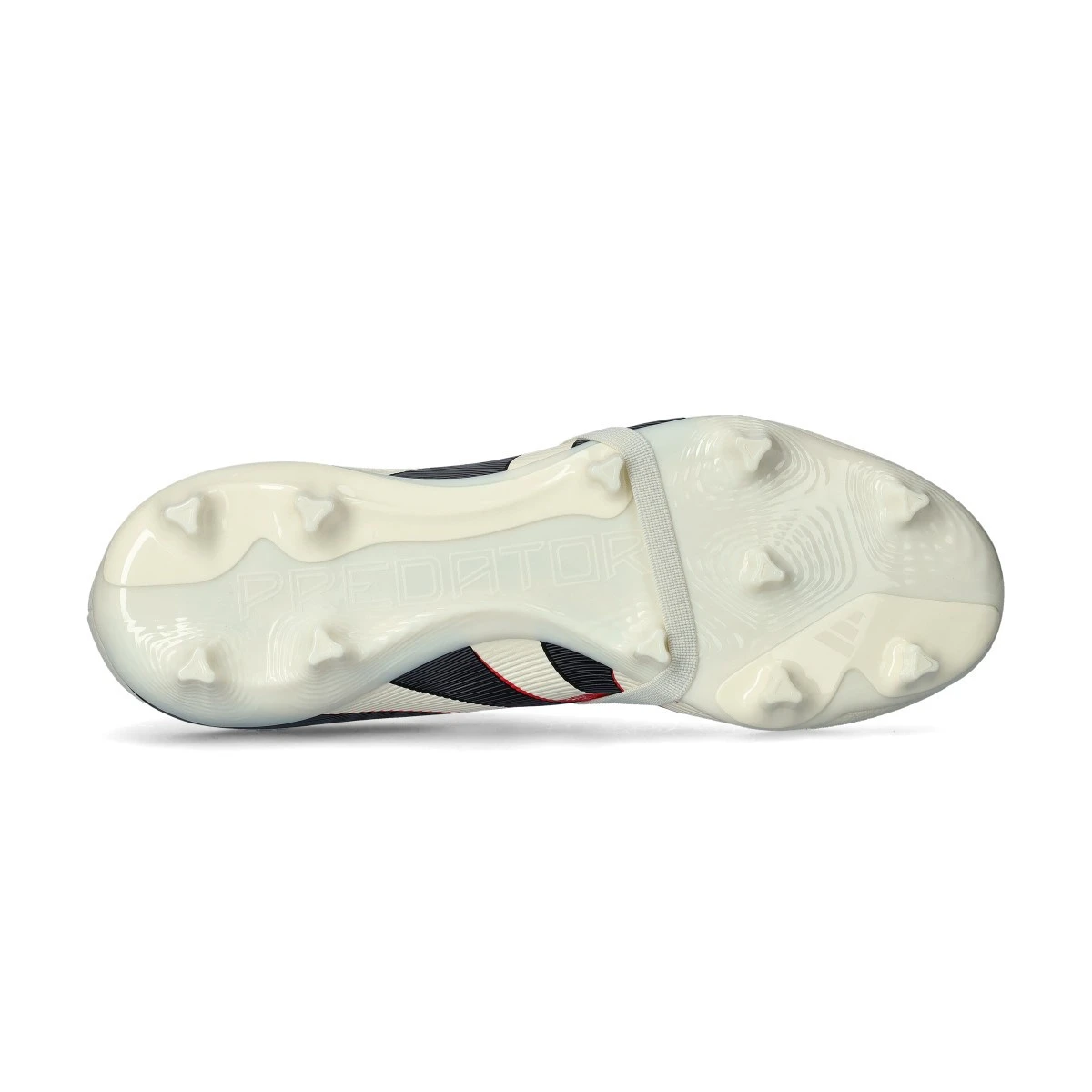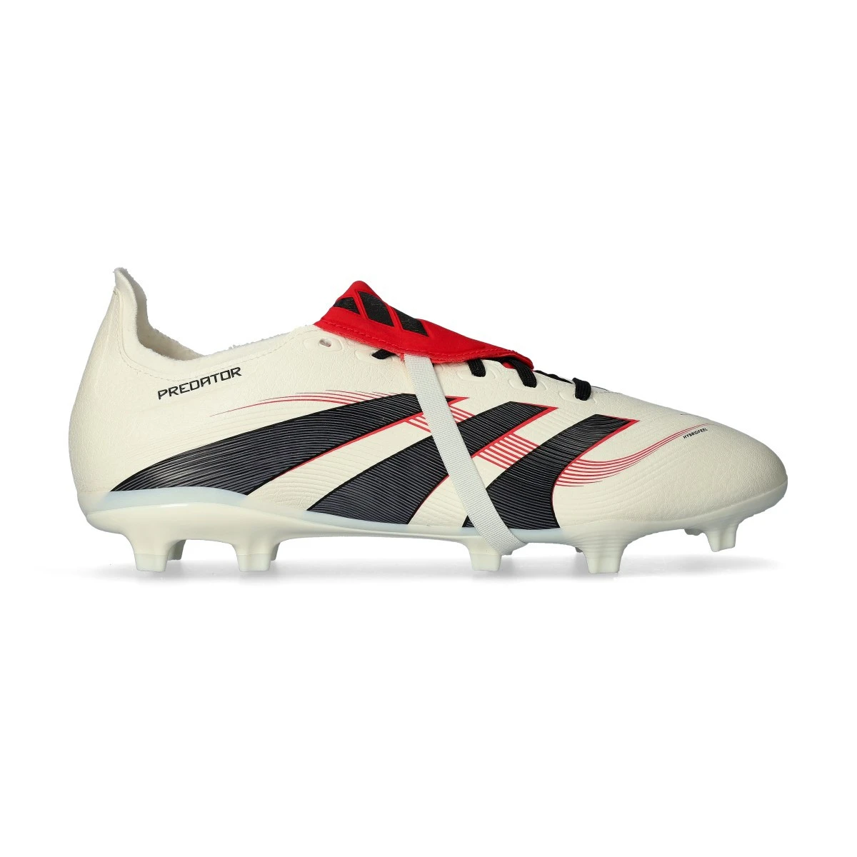 Chaussures de football adidas Predator League FT FG pour adultes. Chaussures synthétiques à lacets pour utilisation sur terrains en gazon naturel. Chaussures de milieu de gamme en coloris Off White-Core Black-Pure Ruby.