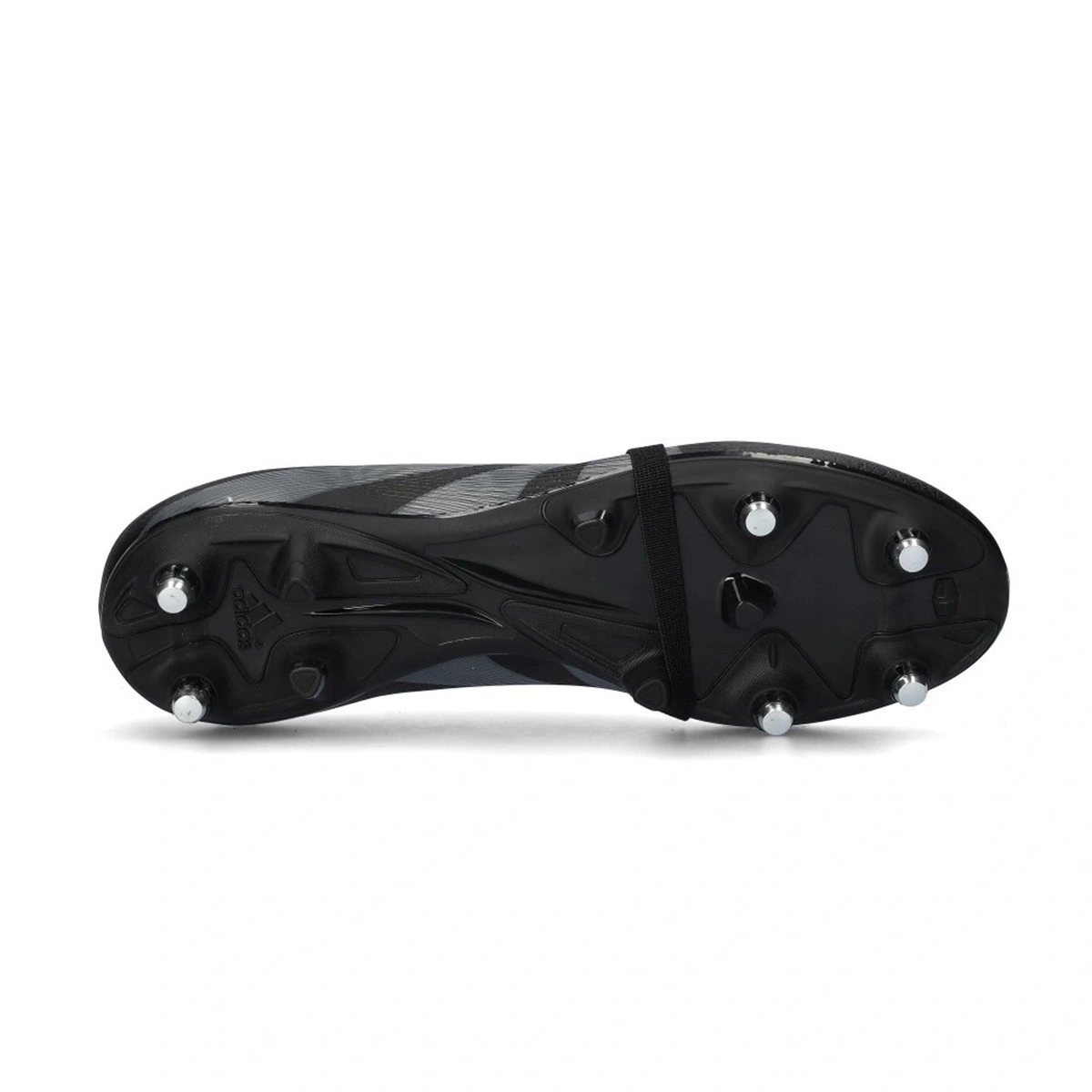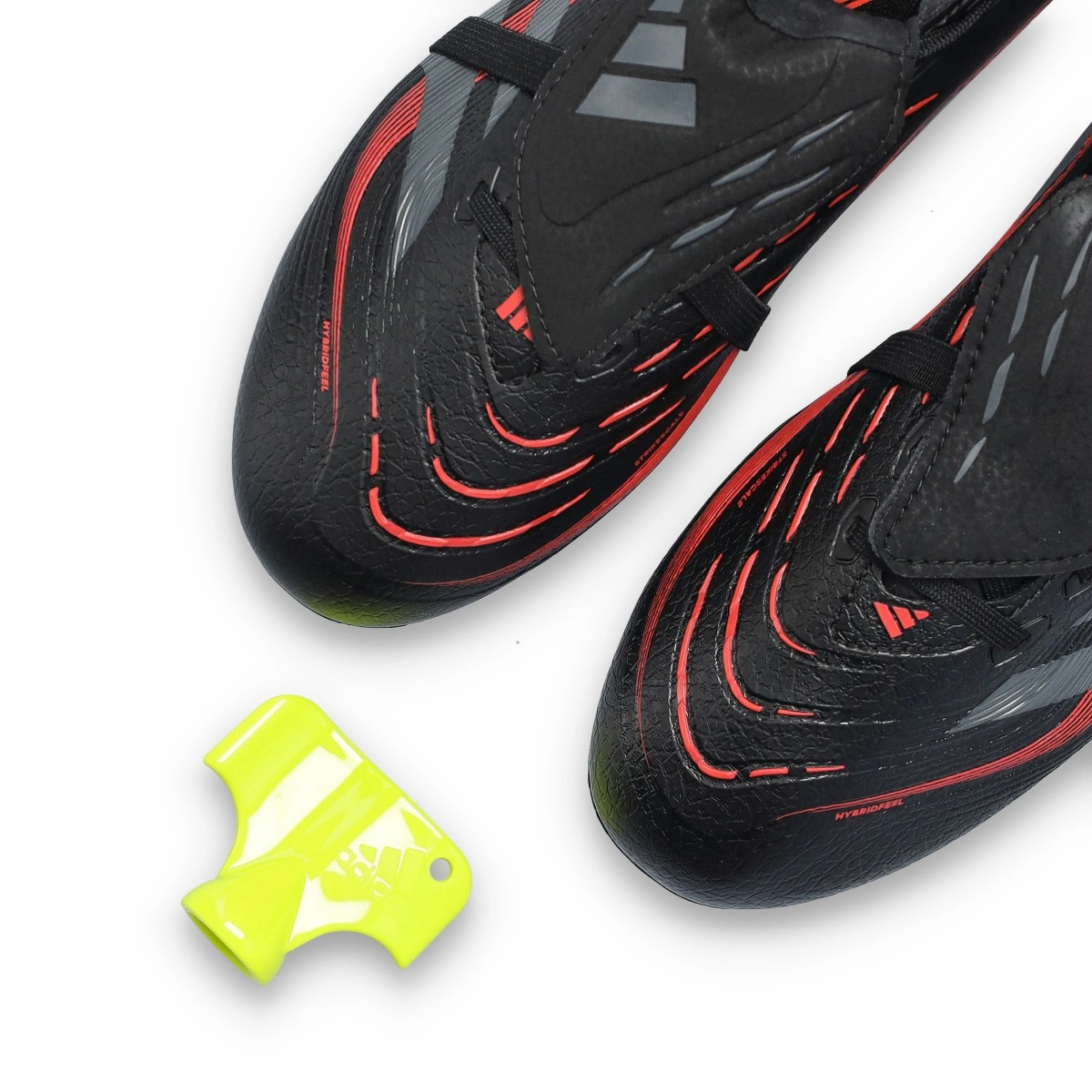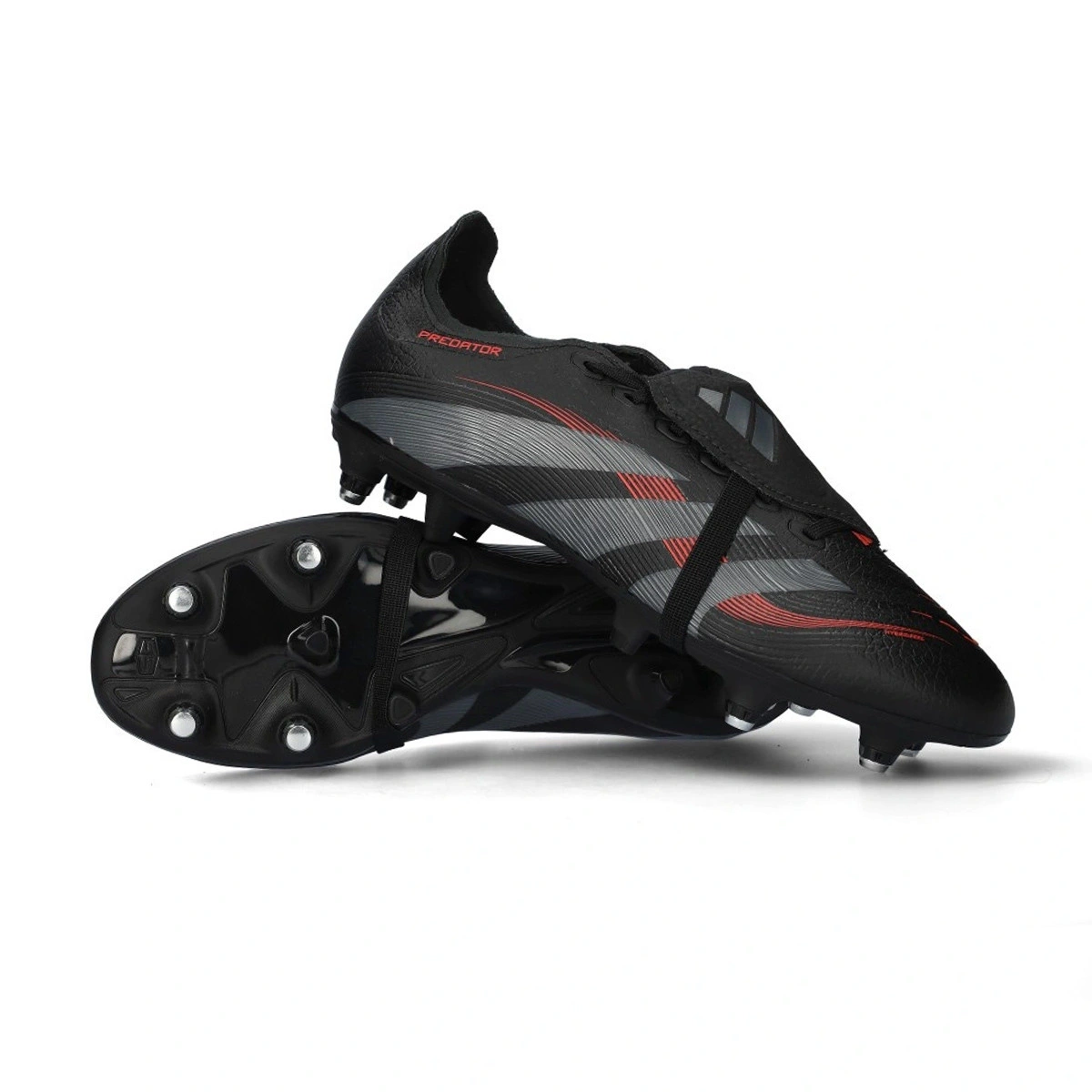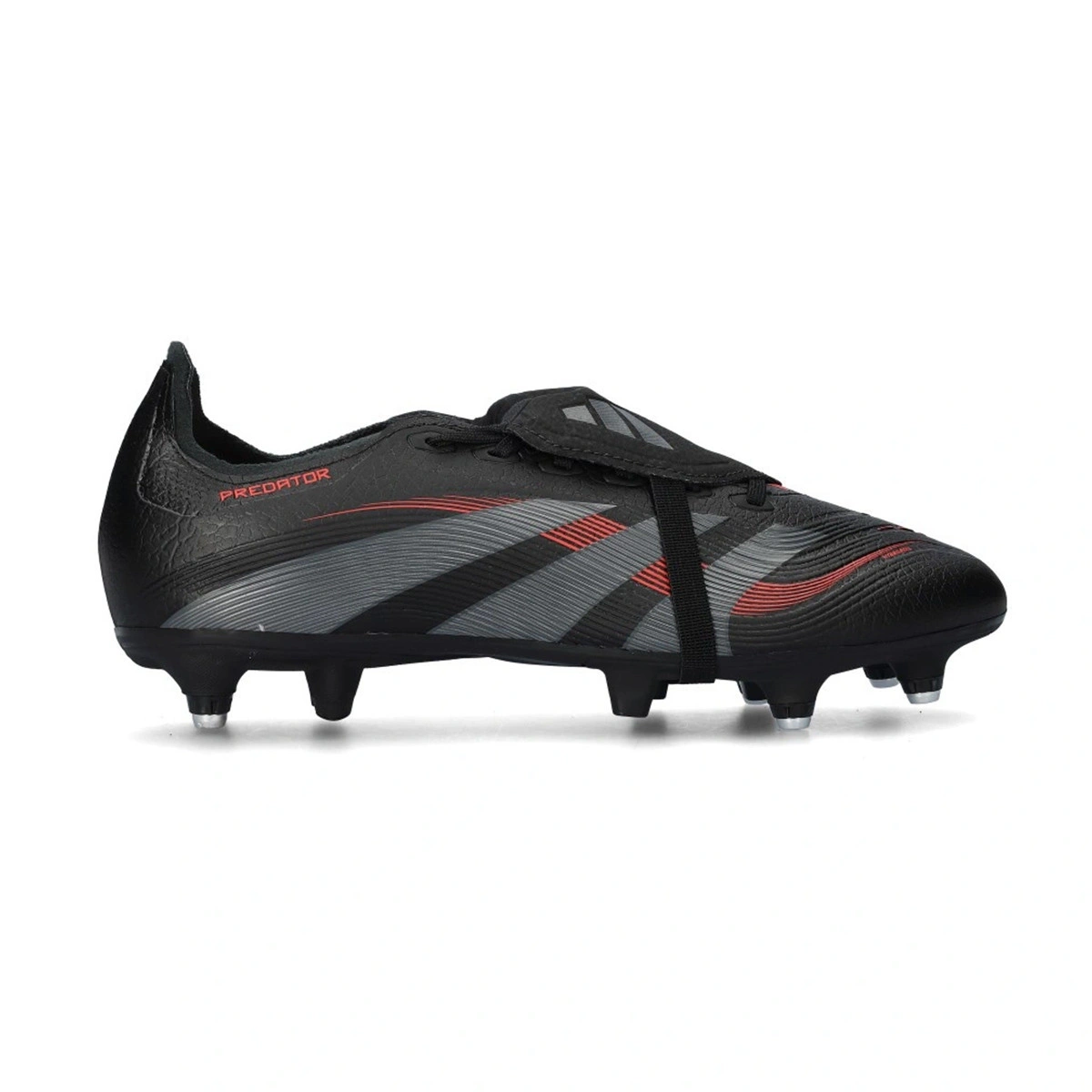 Chaussures de football adidas Predator League FT SG pour adultes. Chaussures synthétiques à lacets à utiliser sur des terrains en gazon naturel humide. Chaussures de gamme moyenne de couleur Core Black-Grey Four-Lucid Red.