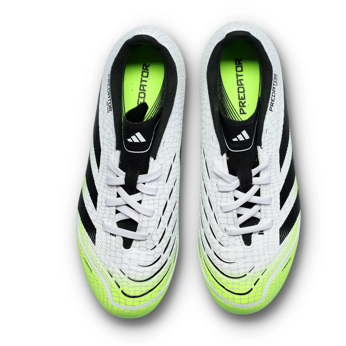 Chaussures adidas Predator League L FG/MG pour enfants. La bonne chaussure pour te démarquer et donner de la précision à tes passes et à tes tirs lors de tes matchs sur gazon naturel sec. La Predator League est disponible en White-Core Black-Lucid Lemon.