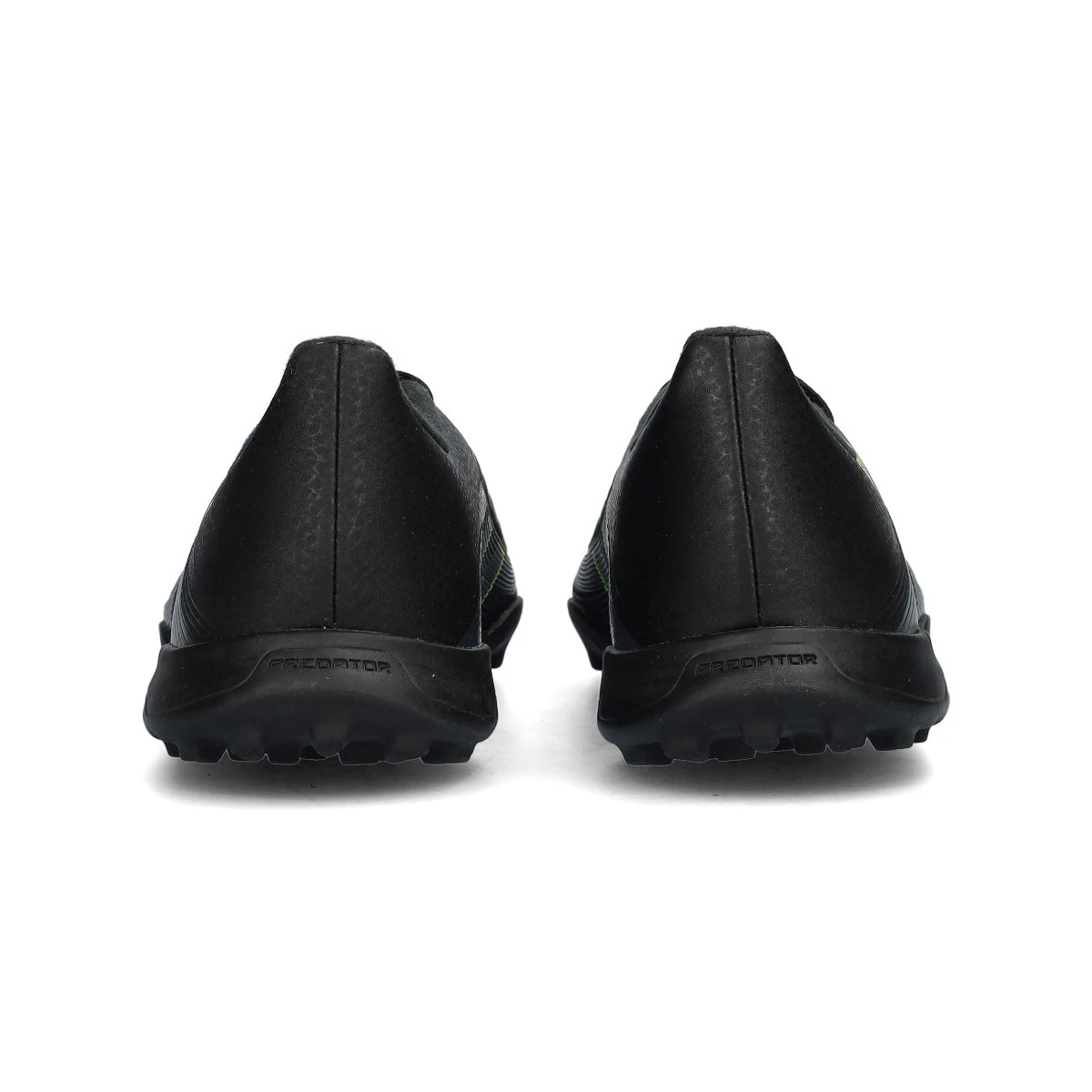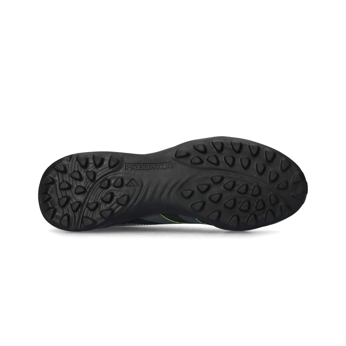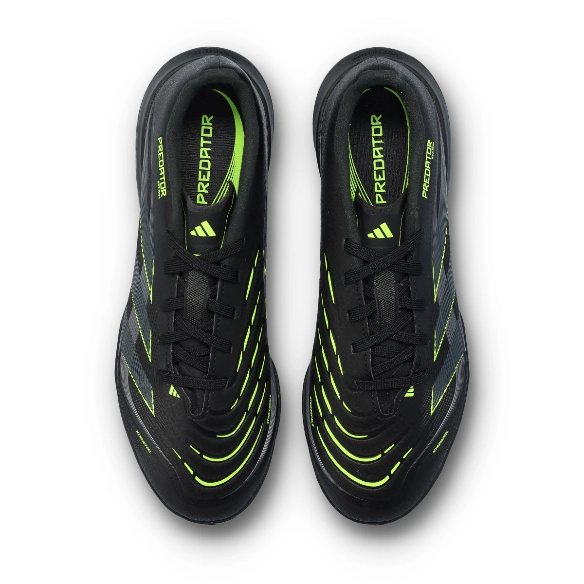 Chaussures synthétiques à lacets, conçues pour une utilisation sur gazon artificiel ou moquette. Modèle haut de gamme dans le coloris Core Black-Carbon-Lucid Lemon.