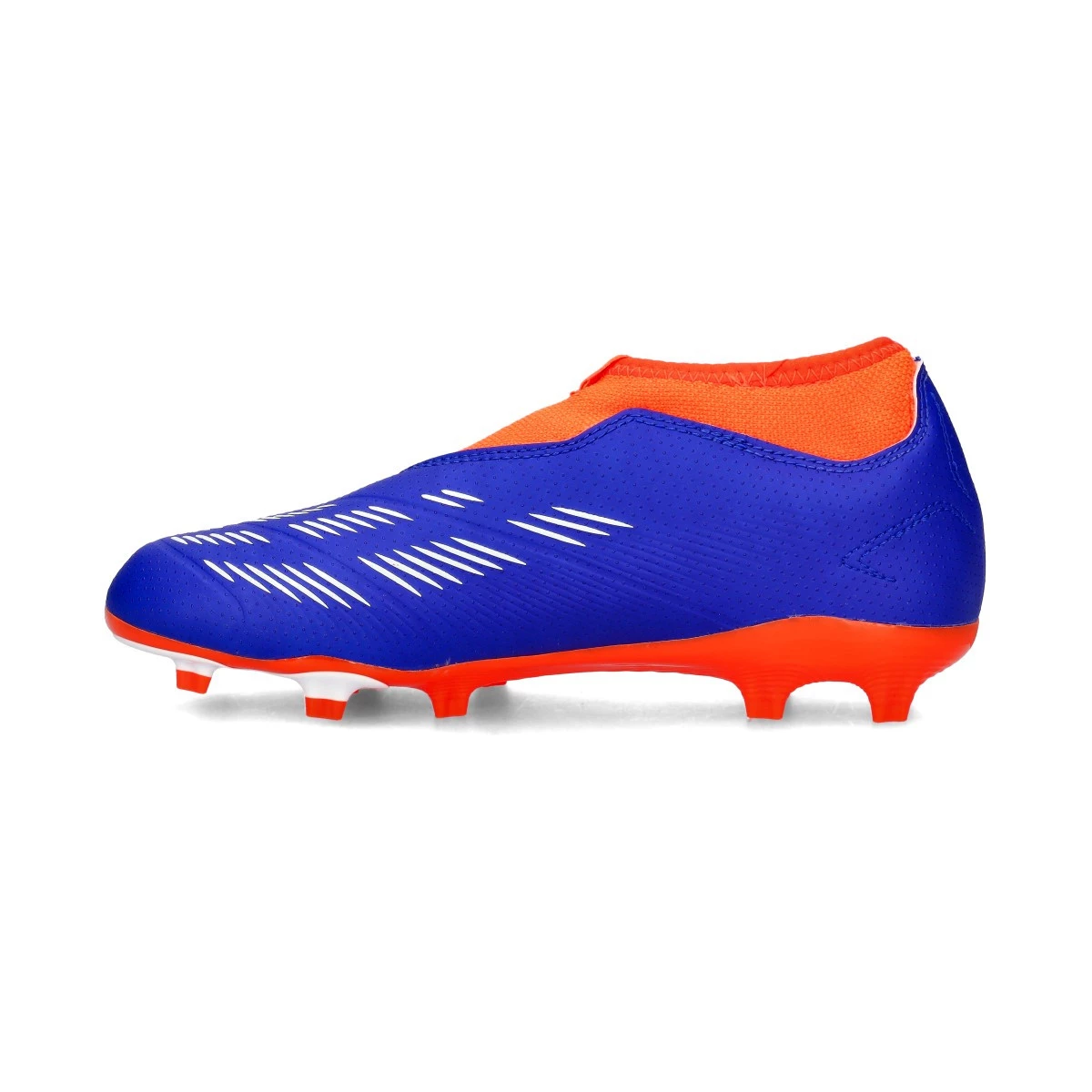 Chaussures de football adidas Predator League LL FG pour enfant. Chaussures synthétiques sans lacets pour une utilisation sur des terrains en terre ou en moquette. Chaussures haut de gamme en Lucid Blue-Ftwr White-Solar Red.