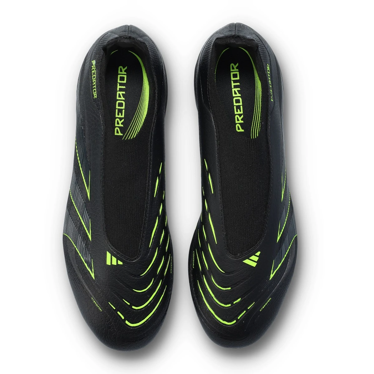 Chaussures de football adidas Predator League LL FG/MG. Chaussures synthétiques sans lacets conçues pour une utilisation sur terrain en terre battue ou moquette. Modèle haut de gamme, coloris Core Black-Carbon-Lucid Lemon.
