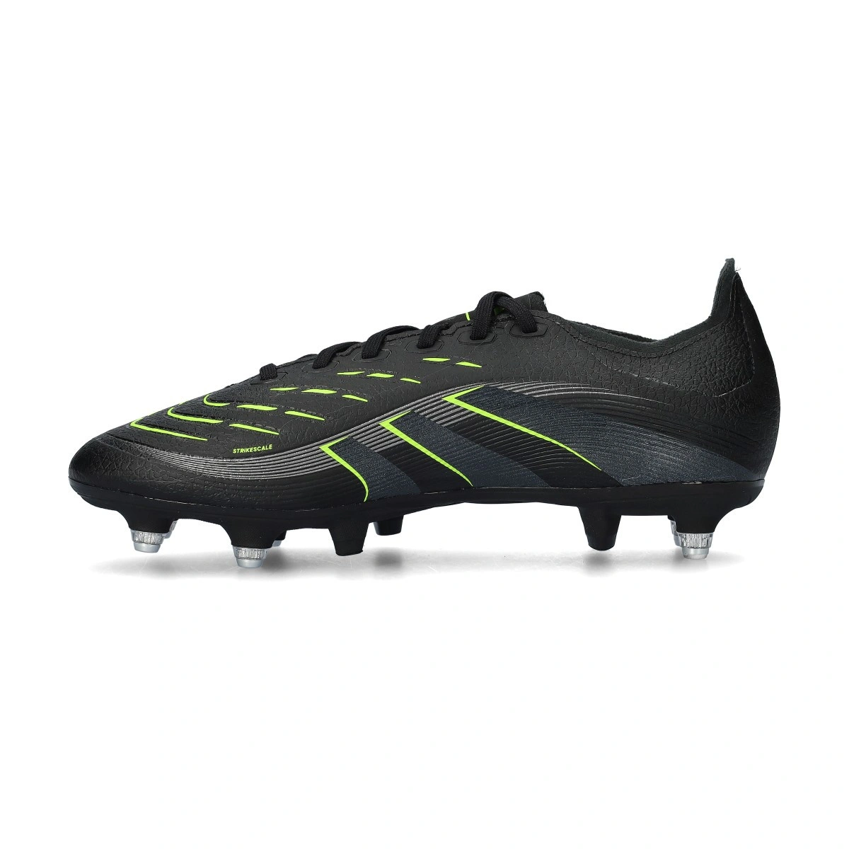 Chaussure de football adidas Predator League L SG pour adultes. Chaussures synthétiques avec lacets à utiliser sur terrains en herbe naturelle humide. Chaussures de gamme intermédiaire en couleur Core Black-Carbon-Lucid Lemon.