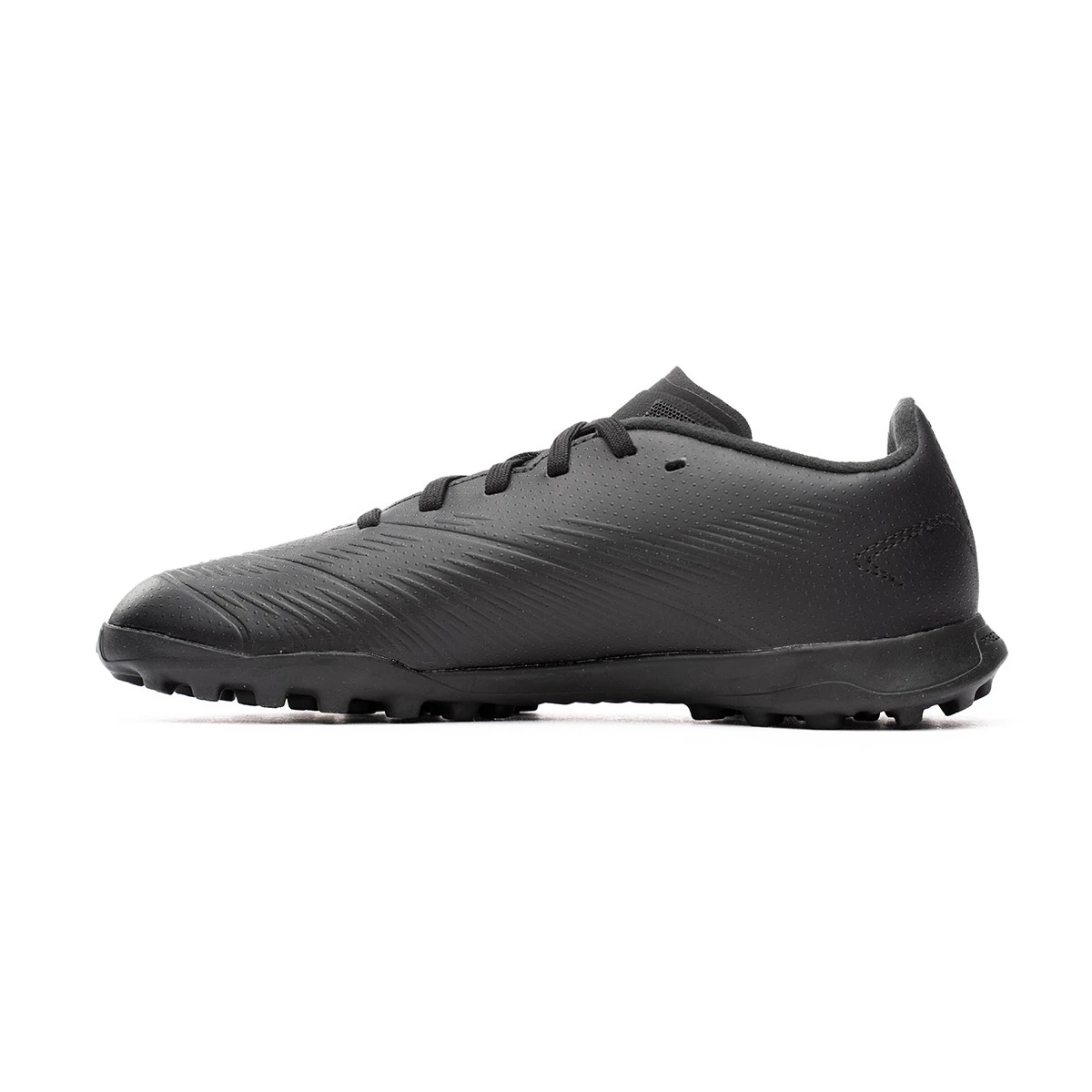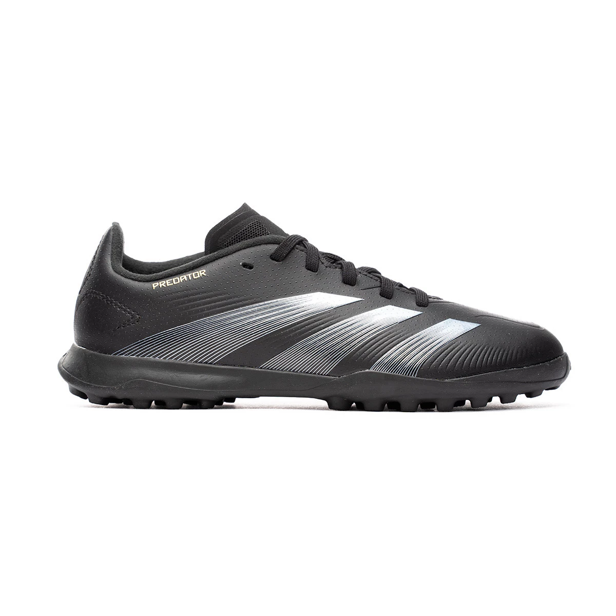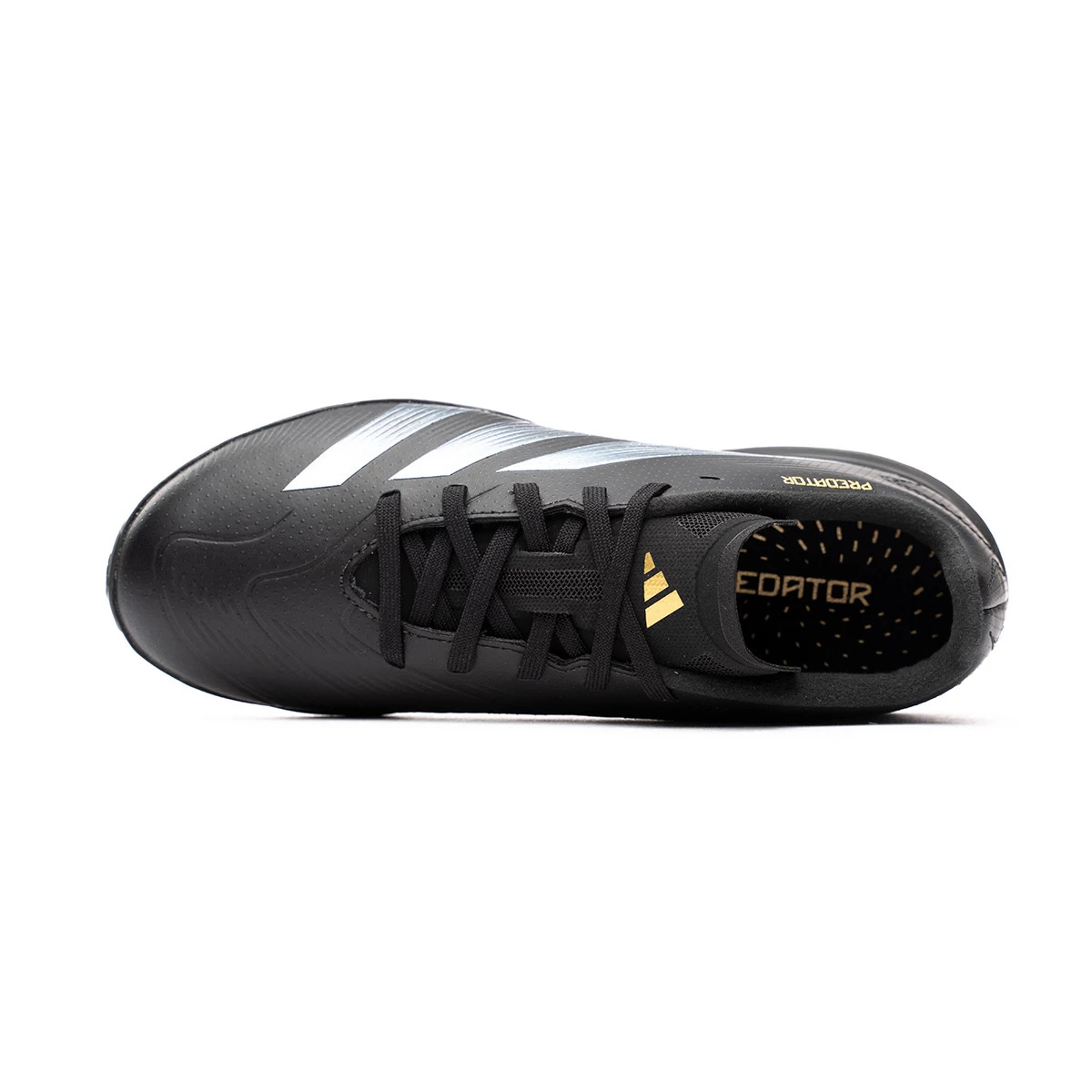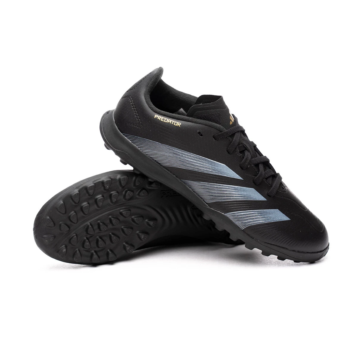 Chaussures de football adidas Predator League L Turf pour enfant. Chaussures synthétiques avec lacets pour utilisation sur les terrains en gazon artificiel avec moquette ou caoutchouc. Chaussures de milieu de gamme en couleur Core Black-Carbon-Gold Met.