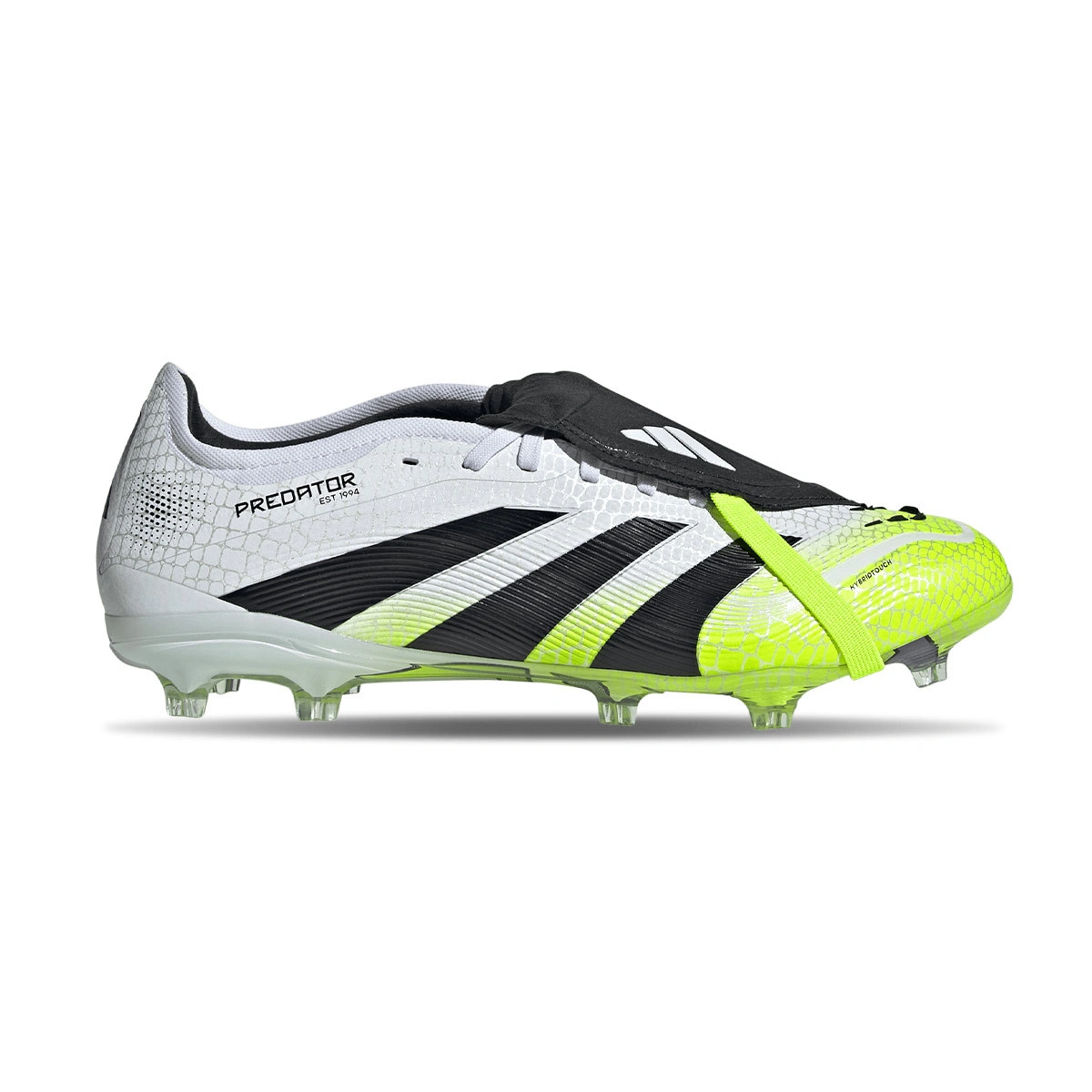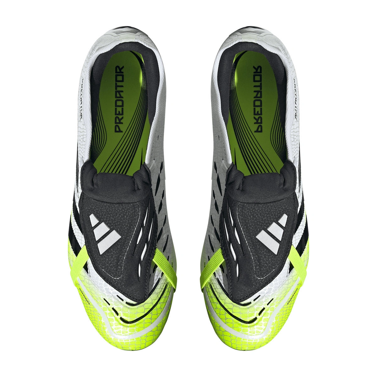 Chaussure Predator Pro FT FG de la marque adidas en coloris White-Core Black-Lucid Lemon. Chaussure de gamme moyenne pour terrains en gazon naturel.
