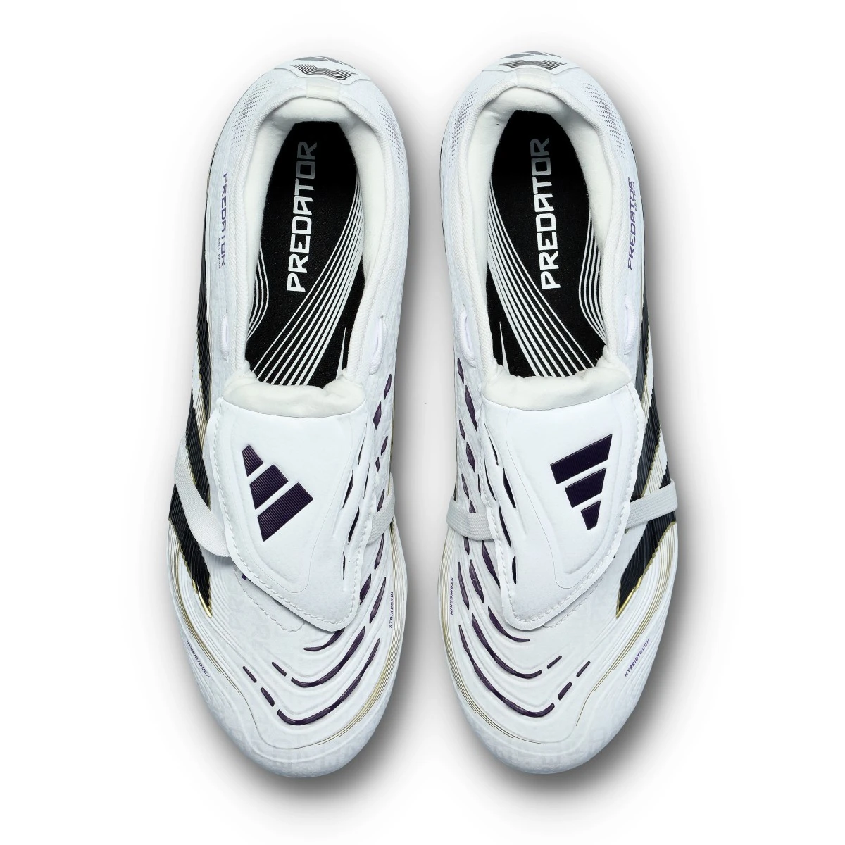Chaussures Predator Pro FT FG d'adidas en blanc-noir-core-métal doré. Chaussure de milieu de gamme pour les terrains en gazon naturel.