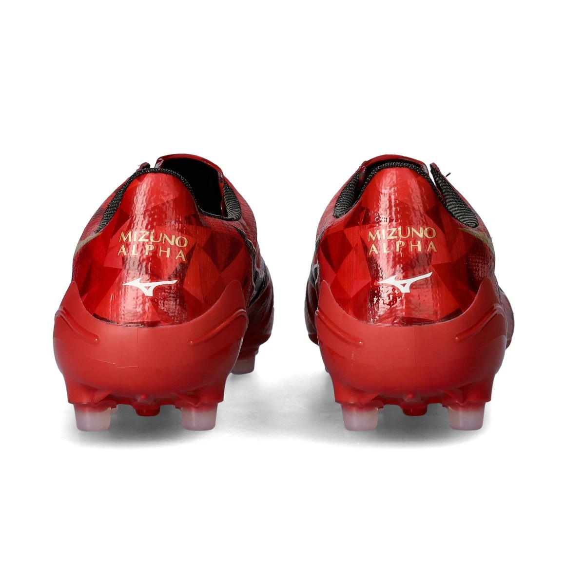 Chaussures de football Mizuno Αlpha Elite II avec semelle AG pour terrains en gazon artificiel. Chaussure adulte Red-Black-Gold avec lacets.