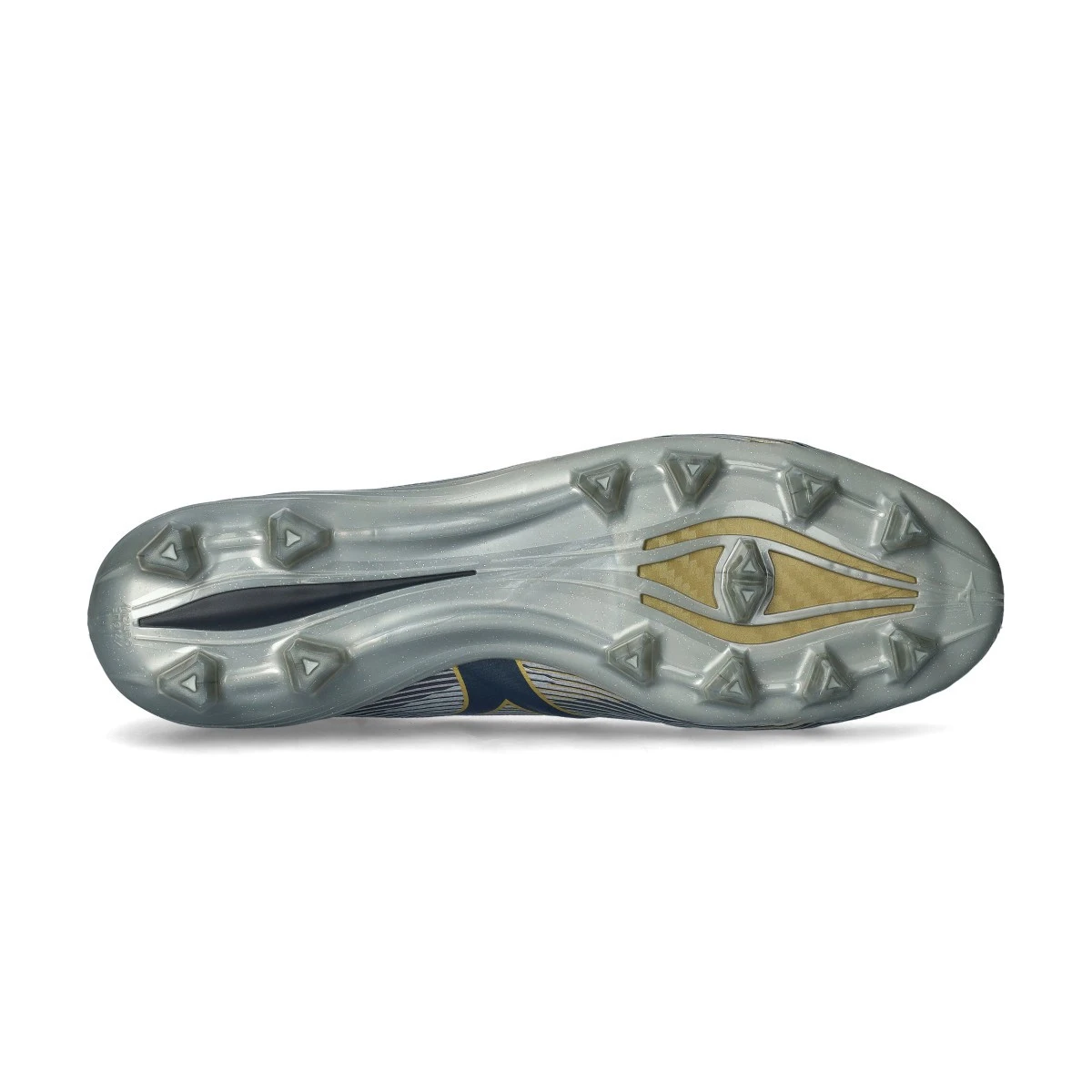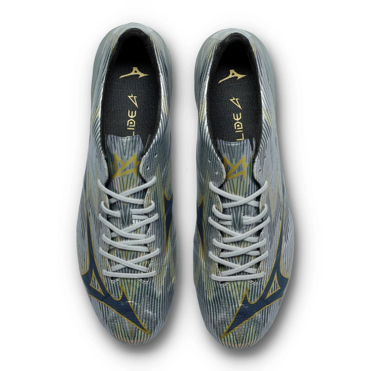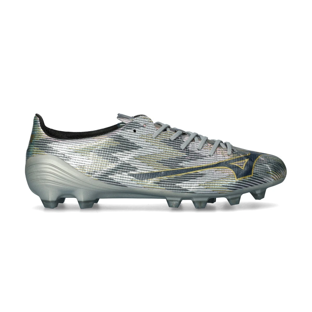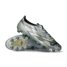 Chaussures de football Mizuno Alpha II Elite FG. Chaussures synthétiques à lacets pour utilisation sur terrains en gazon naturel. Chaussures haut de gamme de couleur Galaxy Silver-8605 C-Gold.