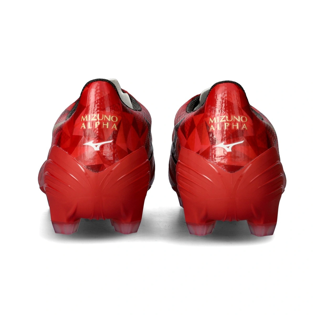 Chaussure de football Mizuno Alpha Pro II avec semelle FG pour terrains en gazon naturel. Modèle adulte en coloris Red-Black-Gold avec lacets.