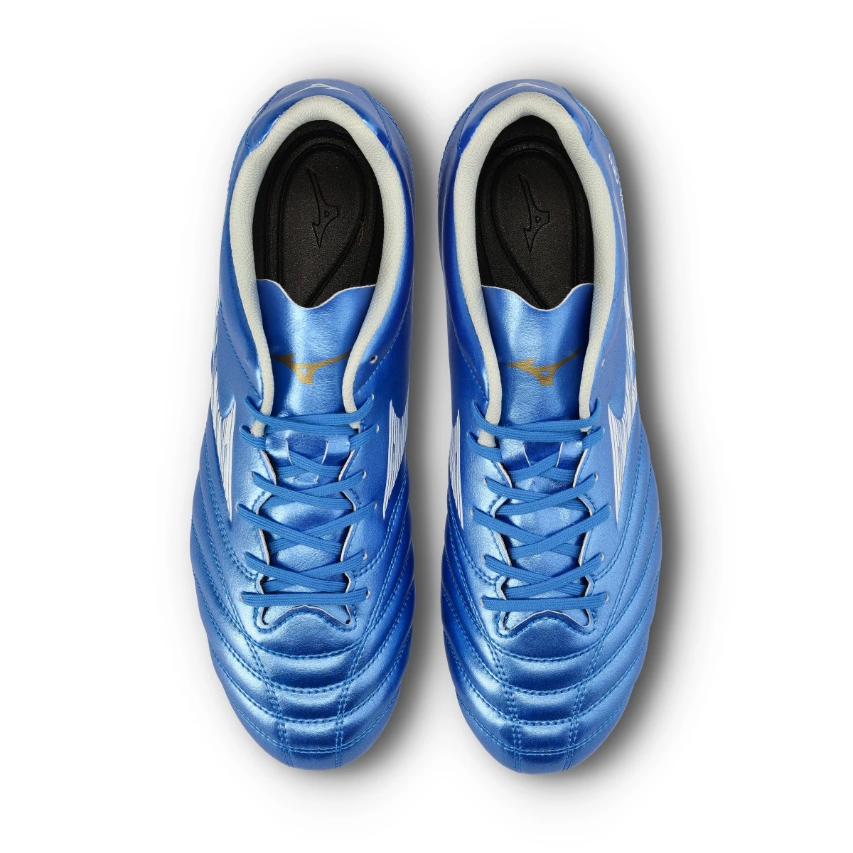Chaussures de football Mizuno Monarcida Neo II Select AG. Chaussure en cuir synthétique pour une utilisation sur les terrains extérieurs et les pelouses artificielles. Chaussure bas de gamme de coloris Laser Blue-White.