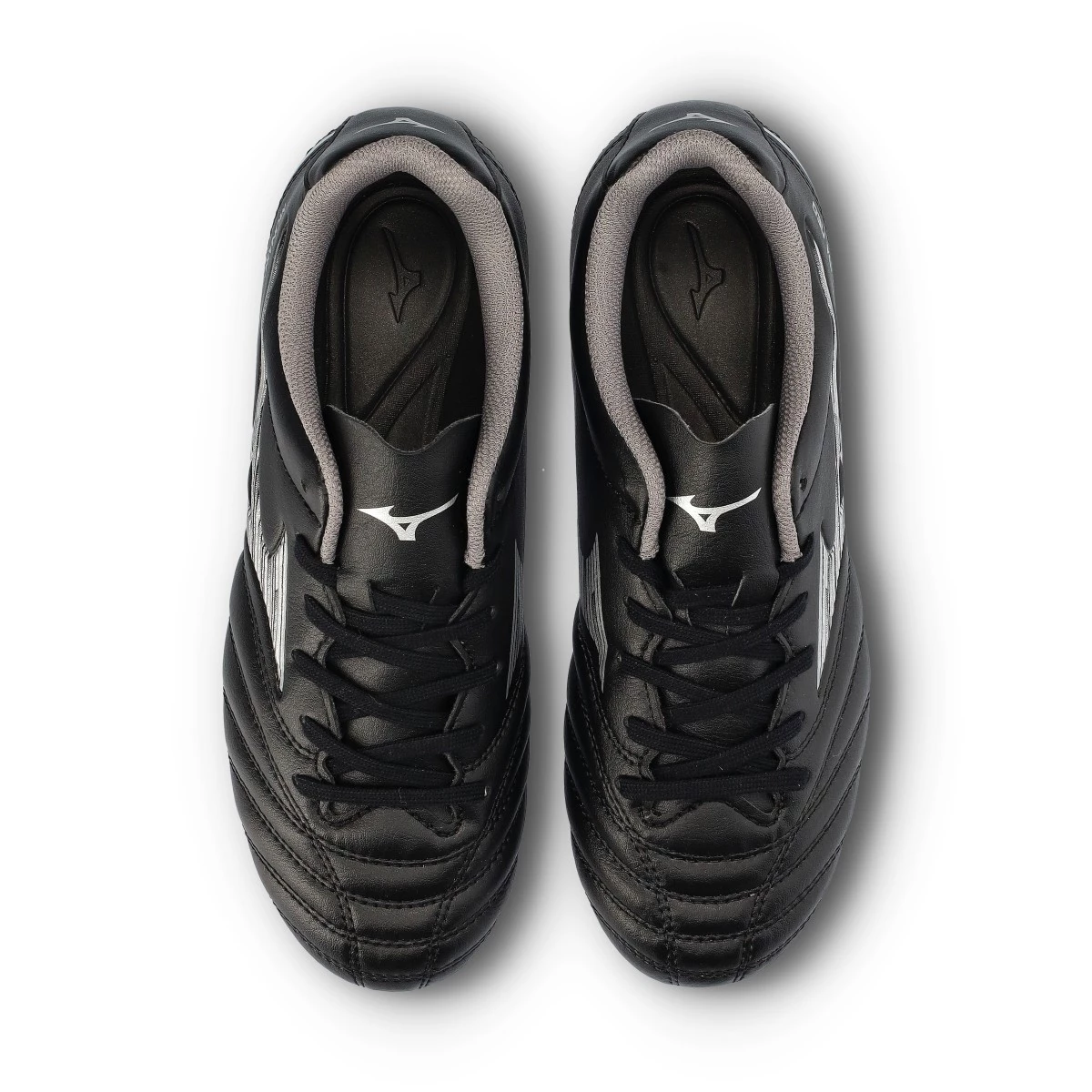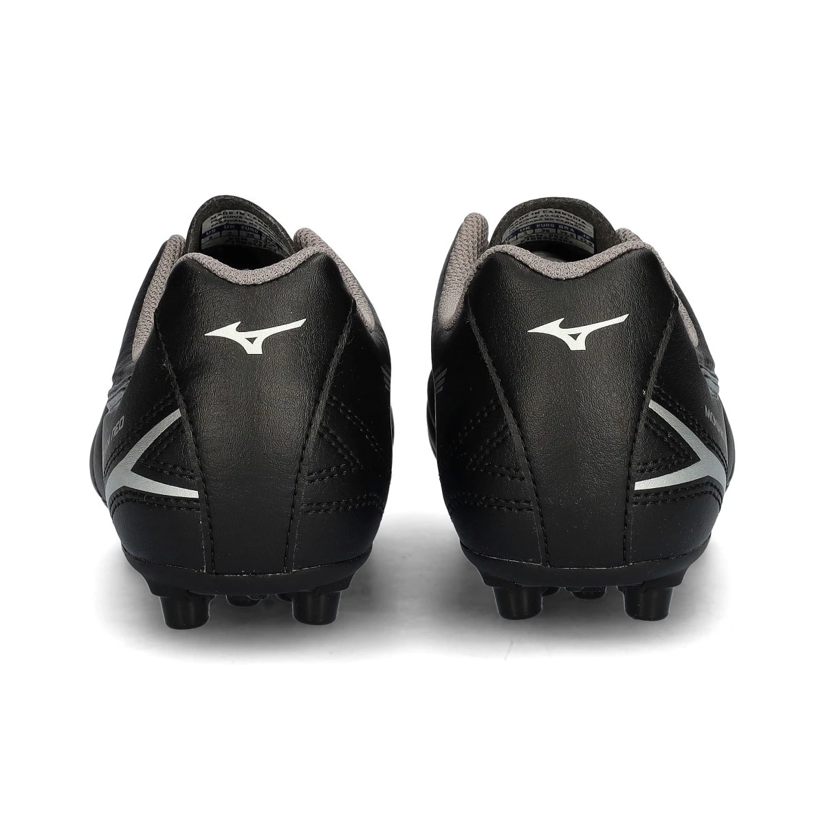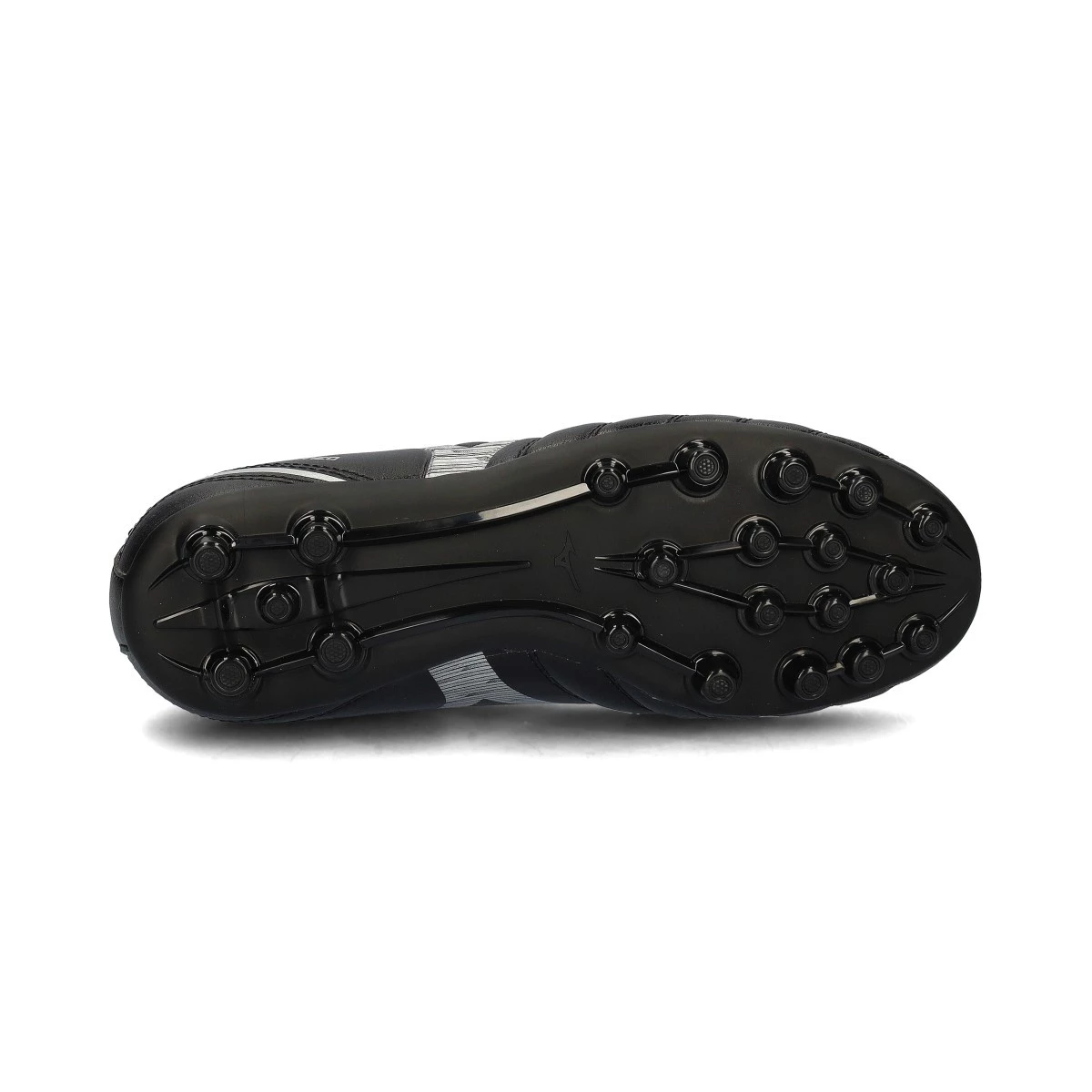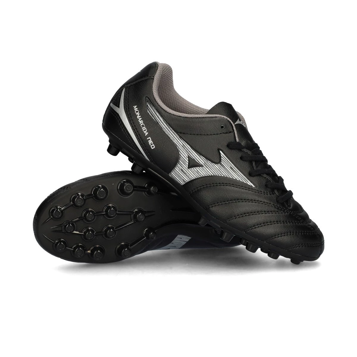 Chaussures de football Mizuno Monarcida Neo II Select AG pour enfants. Chaussure en cuir synthétique pour utilisation sur terrains en gazon artificiel. Chaussure bas de gamme en coloris Black-Silver.