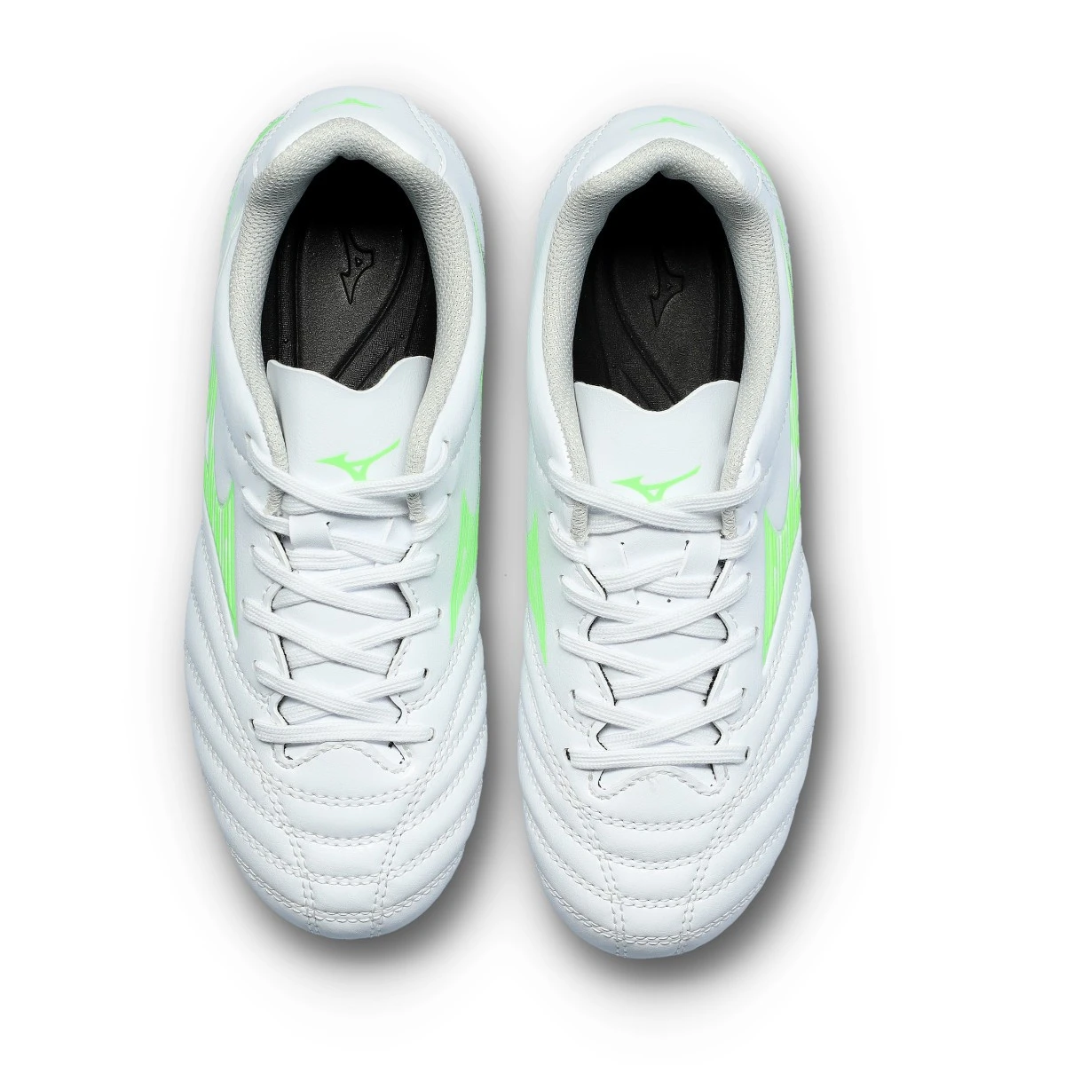Chaussures de football Mizuno Monarcida Neo II Select AG pour enfants. Chaussure en cuir synthétique pour utilisation sur terrains en gazon artificiel. Chaussure basse de couleur White-Neon Green.