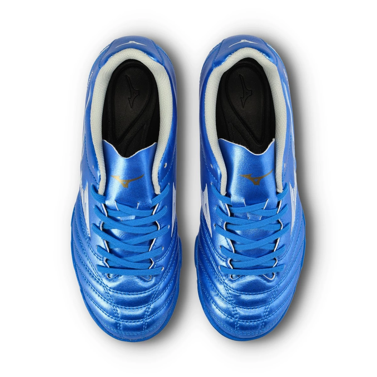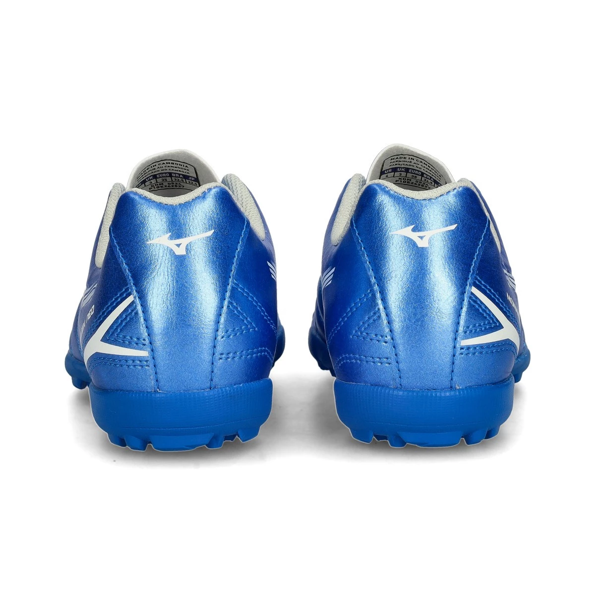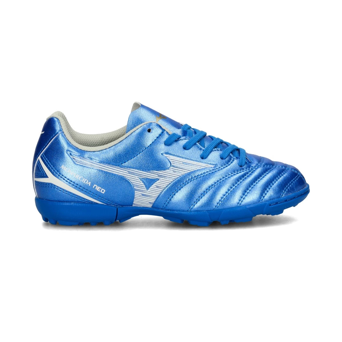 Chaussures de football Mizuno Monarcida Neo II Select Turf. Chaussure en cuir synthétique pour utilisation sur moquette ou terrains en gazon artificiel de première génération. Chaussure bas de gamme de coloris Laser Blue-White.