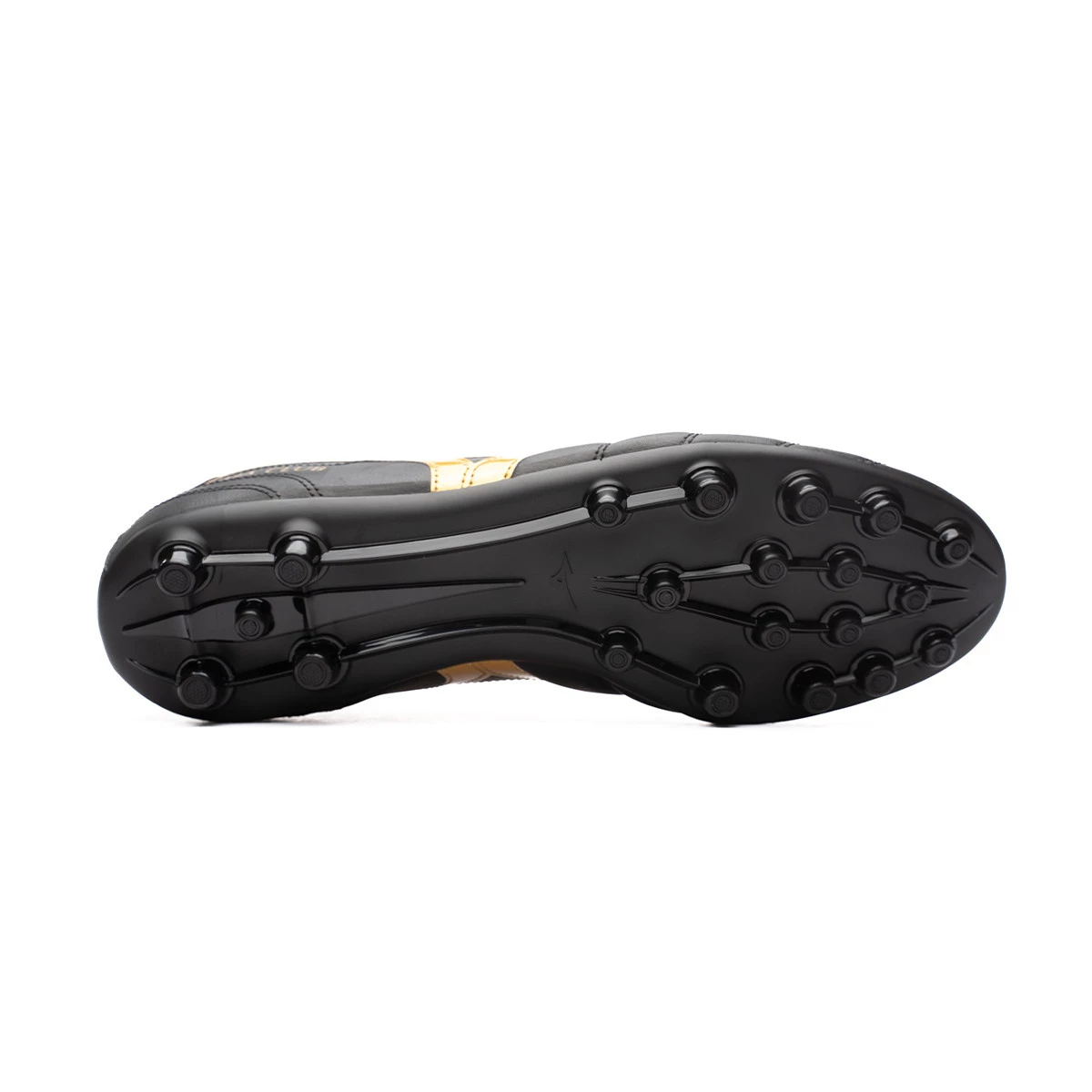 Chaussures de football Mizuno Morelia Neo II Club AG. Chaussures de football pour terrains en gazon artificiel en Black-Gold-Dark Shadow.