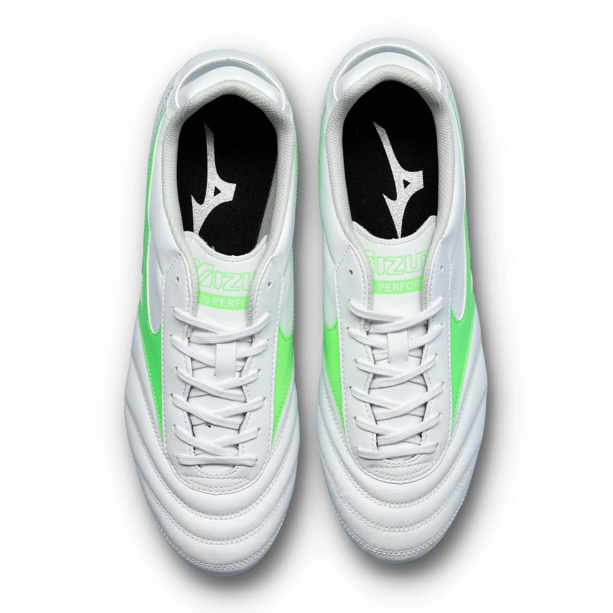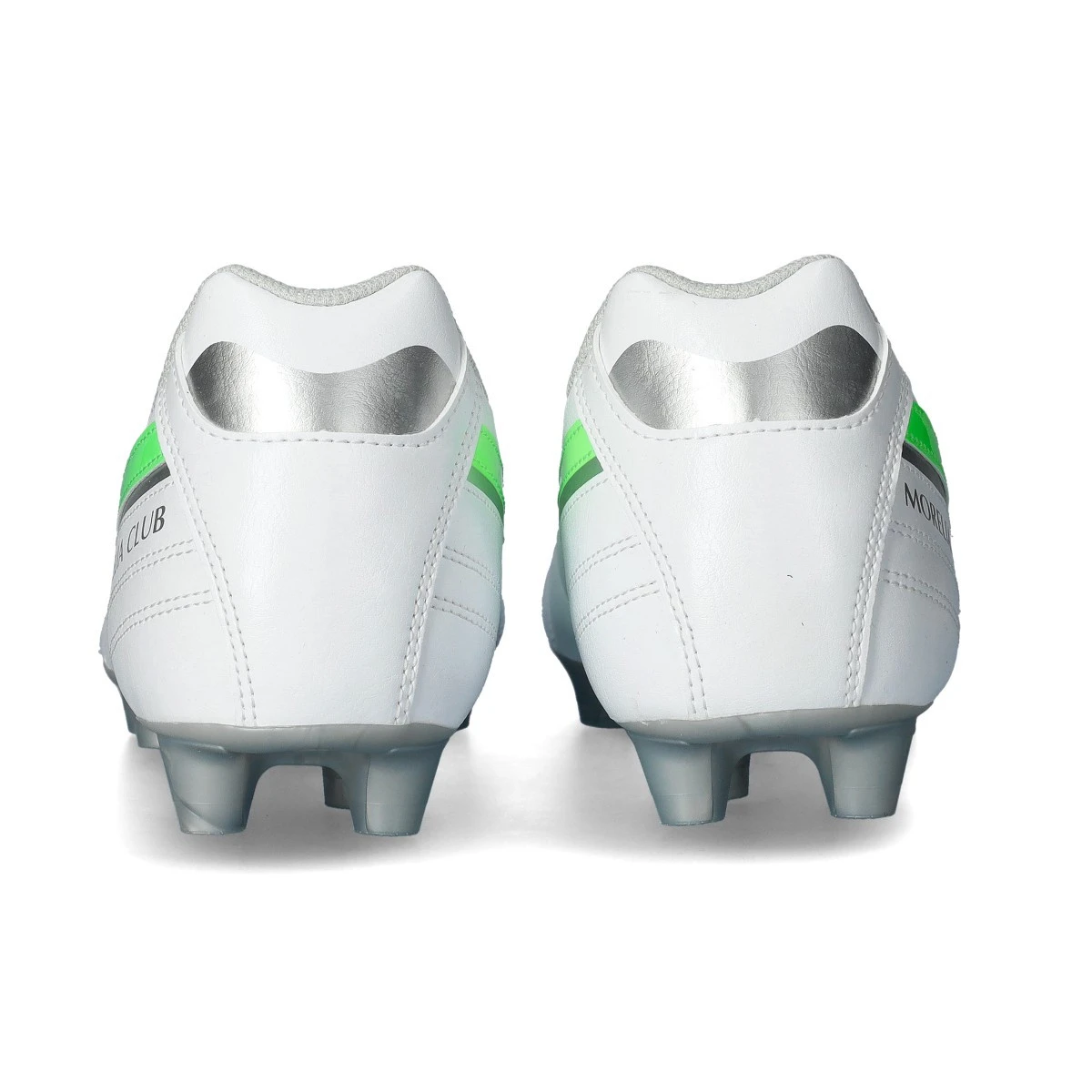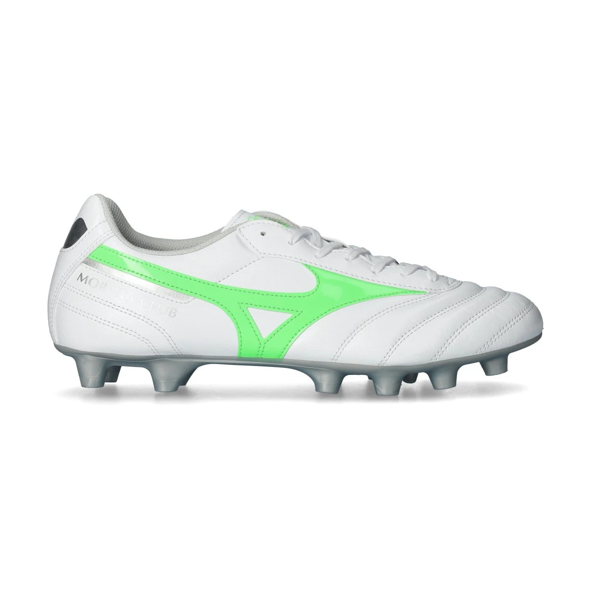Chaussures de football Mizuno Morelia II Club FG. Chaussure pour adultes, de couleur White-Neon Green-Galaxy Silver, gamme de base pour les terrains en gazon naturel.