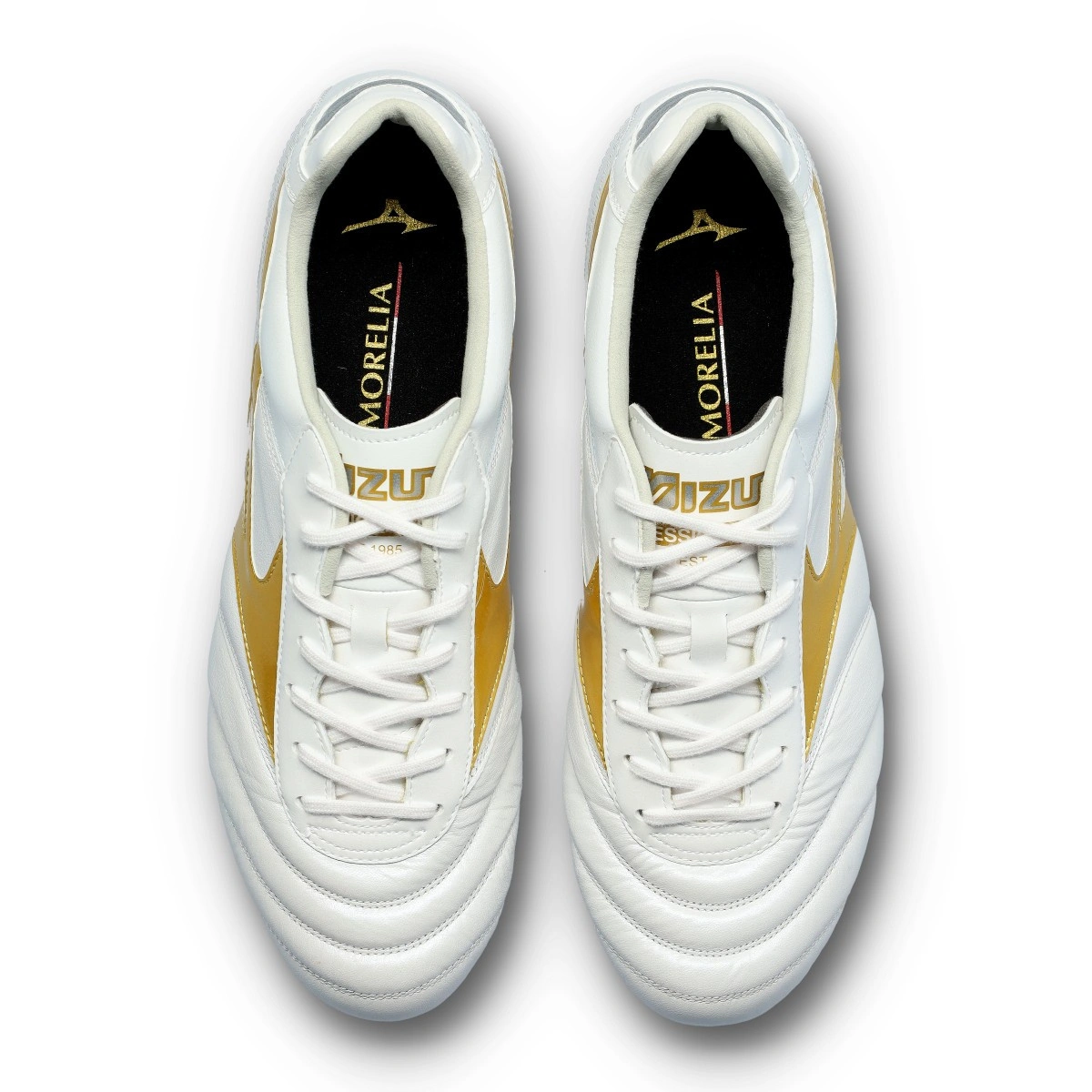 Chaussures de football Mizuno Morelia II Elite FG pour terrains naturels. Chaussure haut de gamme en coloris White-Football Gold-Galaxy Silver.