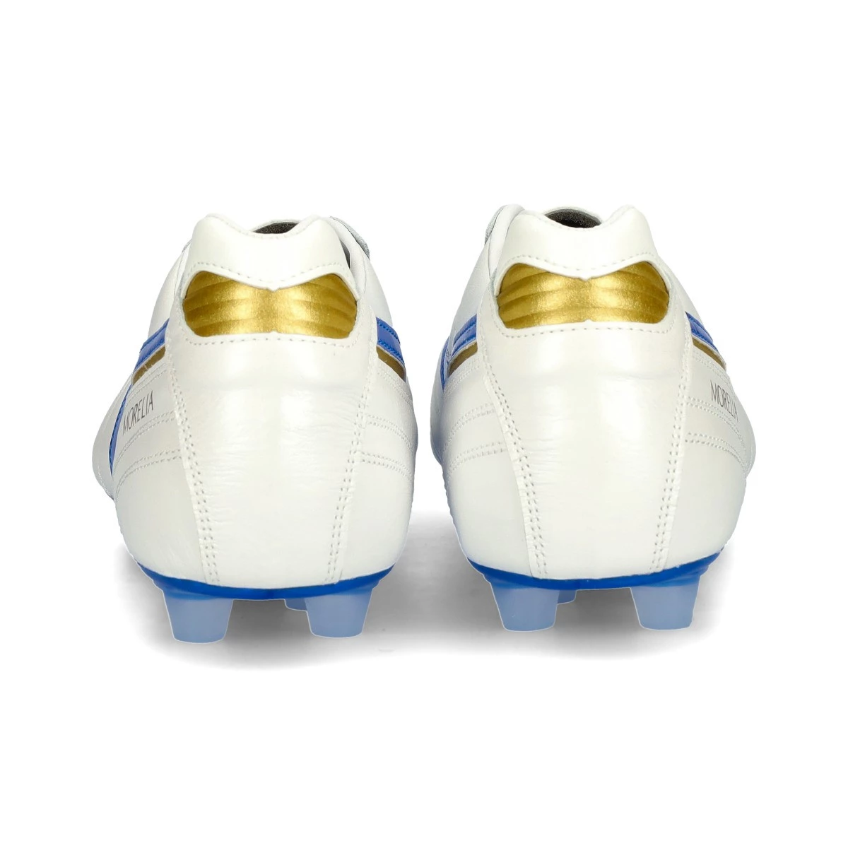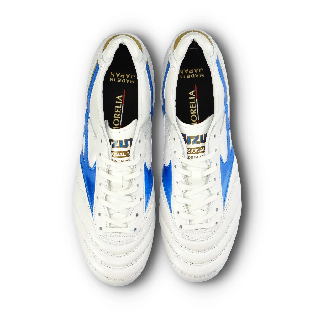 Chaussures de footbal Mizuno Morelia II Japan en cuir de kangourou à utiliser sur gazon naturel en White-Blue.