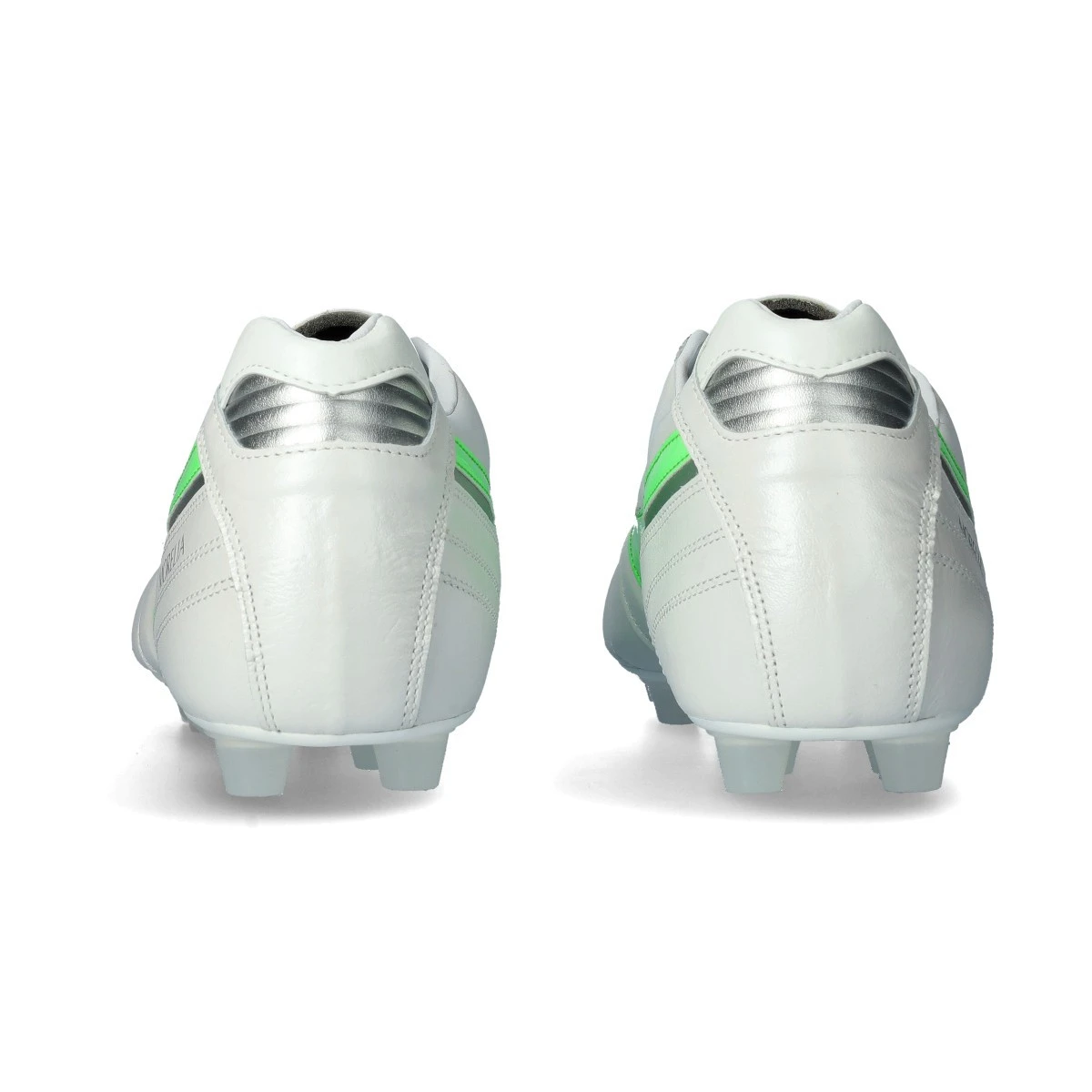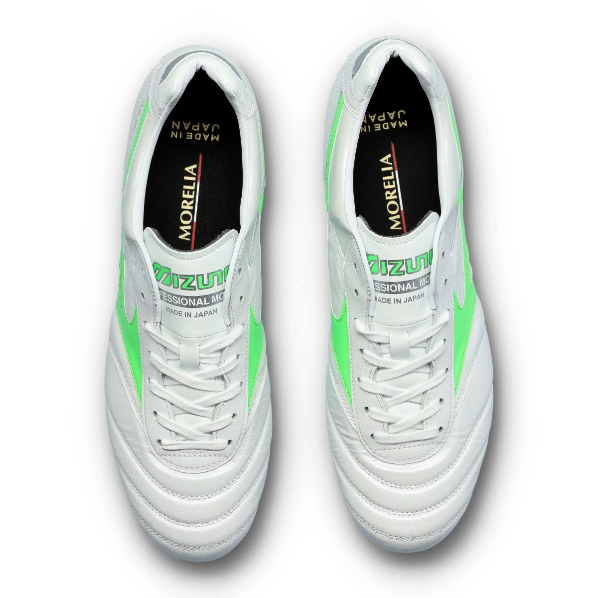 Chaussures de football Mizuno Morelia II Japan en cuir de kangourou pour gazon naturel, terre et même gazon artificiel en White-Neon Green-Galaxy Silver .