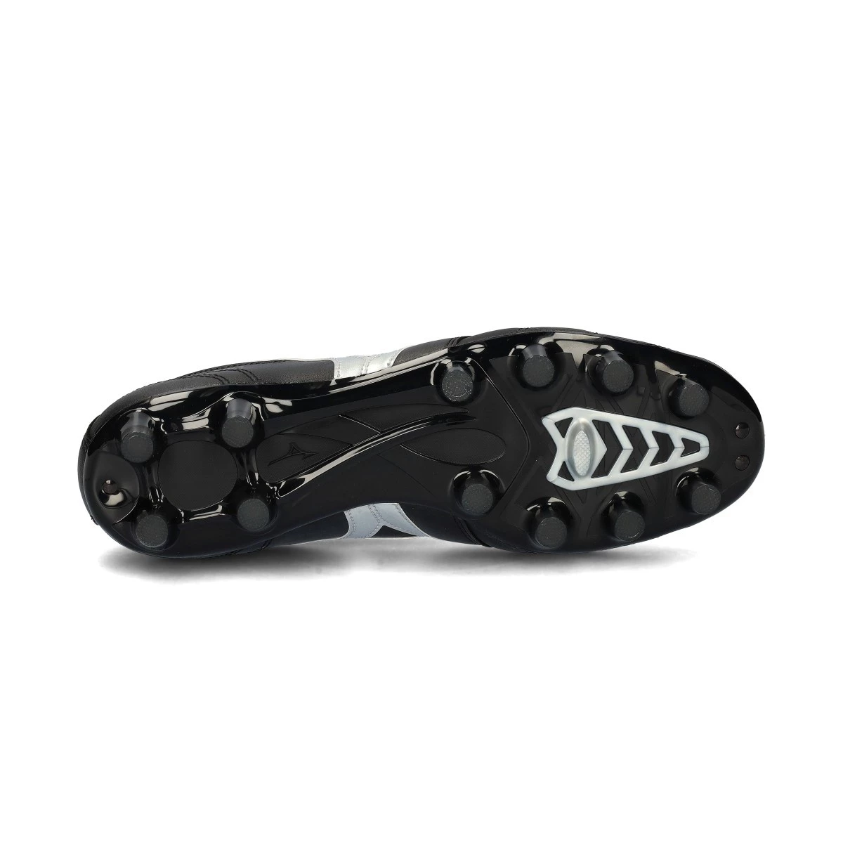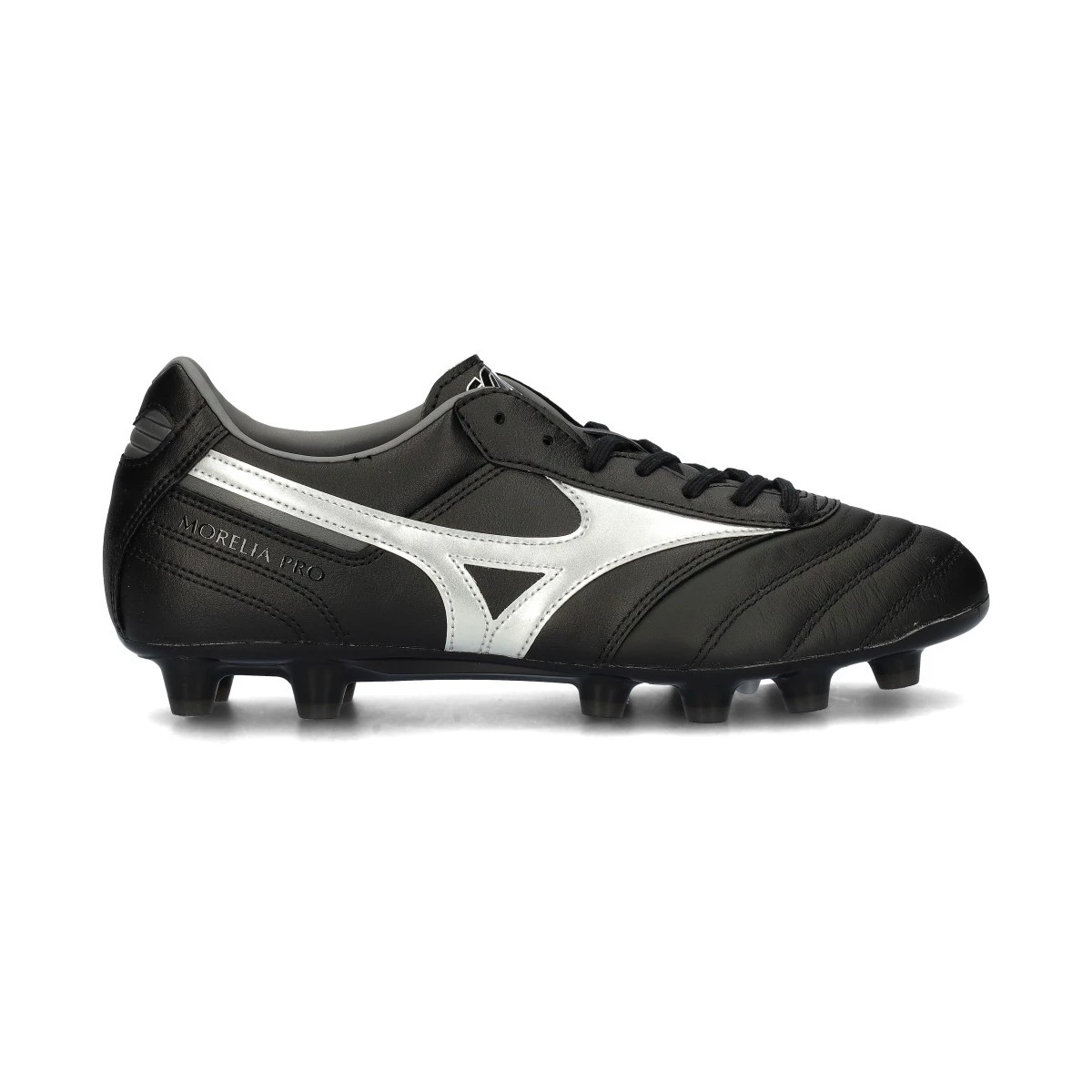 Chaussures de football Mizuno Morelia II Pro FG pour terrains en gazon naturel en coloris Black-Galaxy Silver-Dark Shadow. Chaussures pour joueurs de niveau intermédiaire.