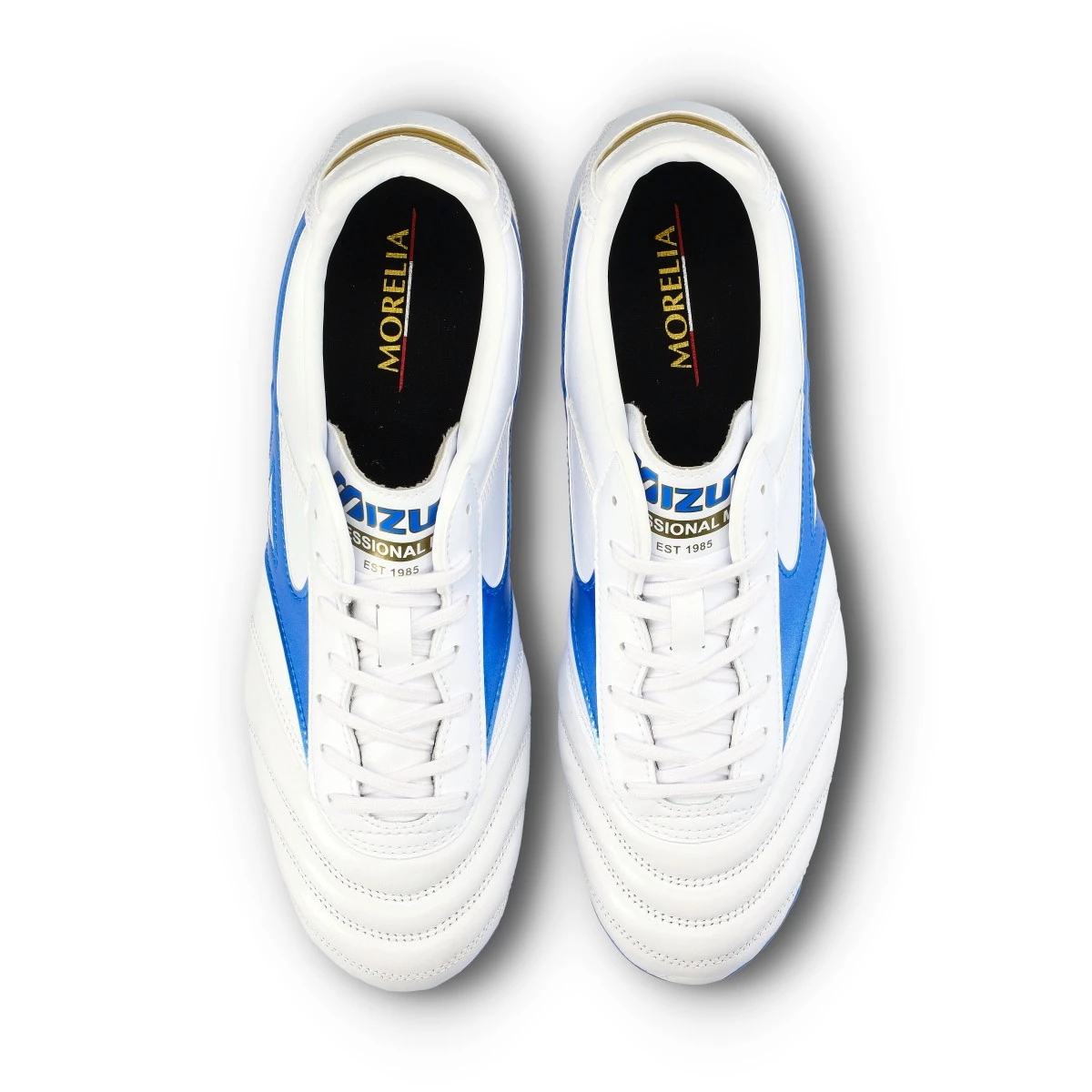 Chaussures de football Mizuno Morelia II Pro FG pour terrains en gazon naturel coloris White-Laser Blue-Gold.