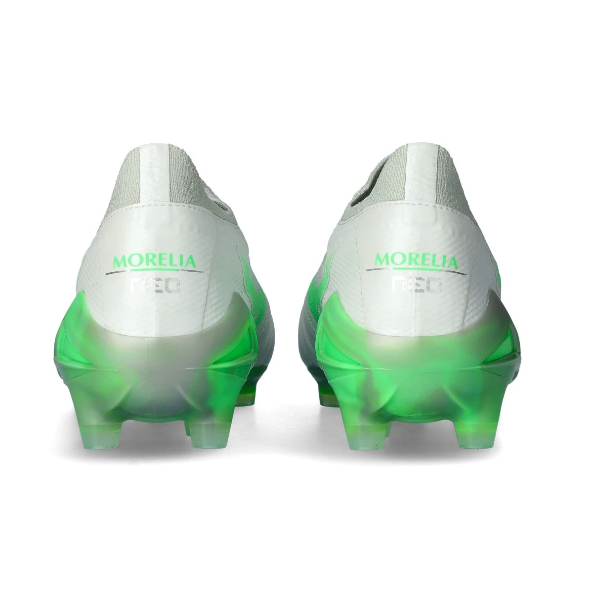 Chaussures de football Morelia Neo IV Beta Elite FG. Chaussures en cuir de kangourou, pour les terrains en gazon naturel. Chaussures haut de gamme en White-Neon Green-Cool Gray.