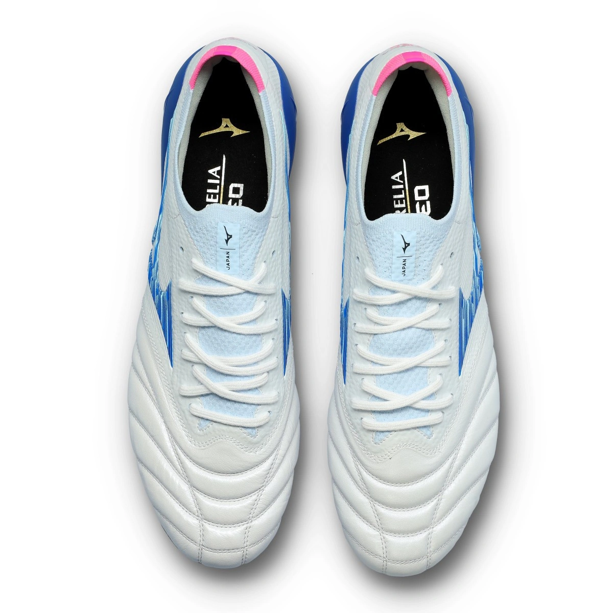 Chaussures de football en cuir de kangourou Mizuno Morelia Neo IV Japan FG pour gazon naturel, couleur White-Tanager Turquoise-Pink Tetra