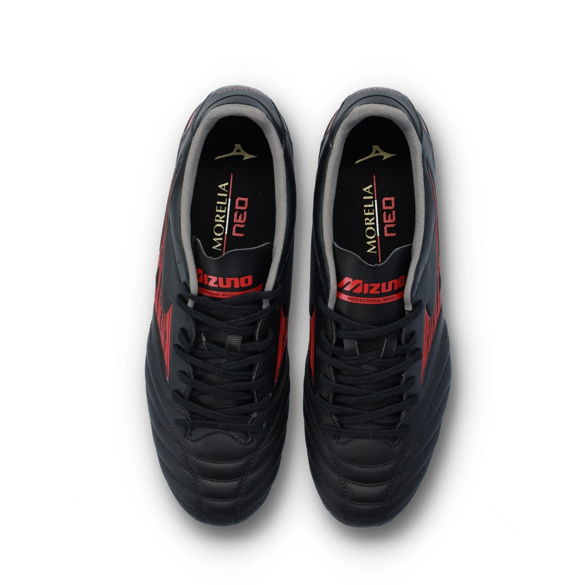 Chaussures Mizuno Morelia Neo IV Pro FG. Pour terrains en gazon naturel, coloris Black-Red-Black.