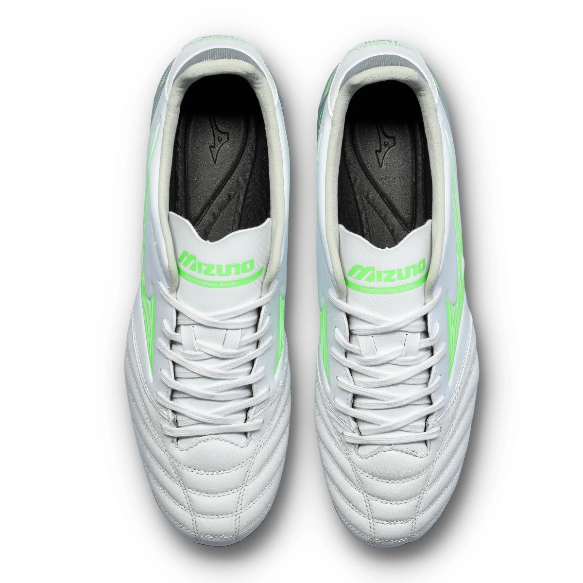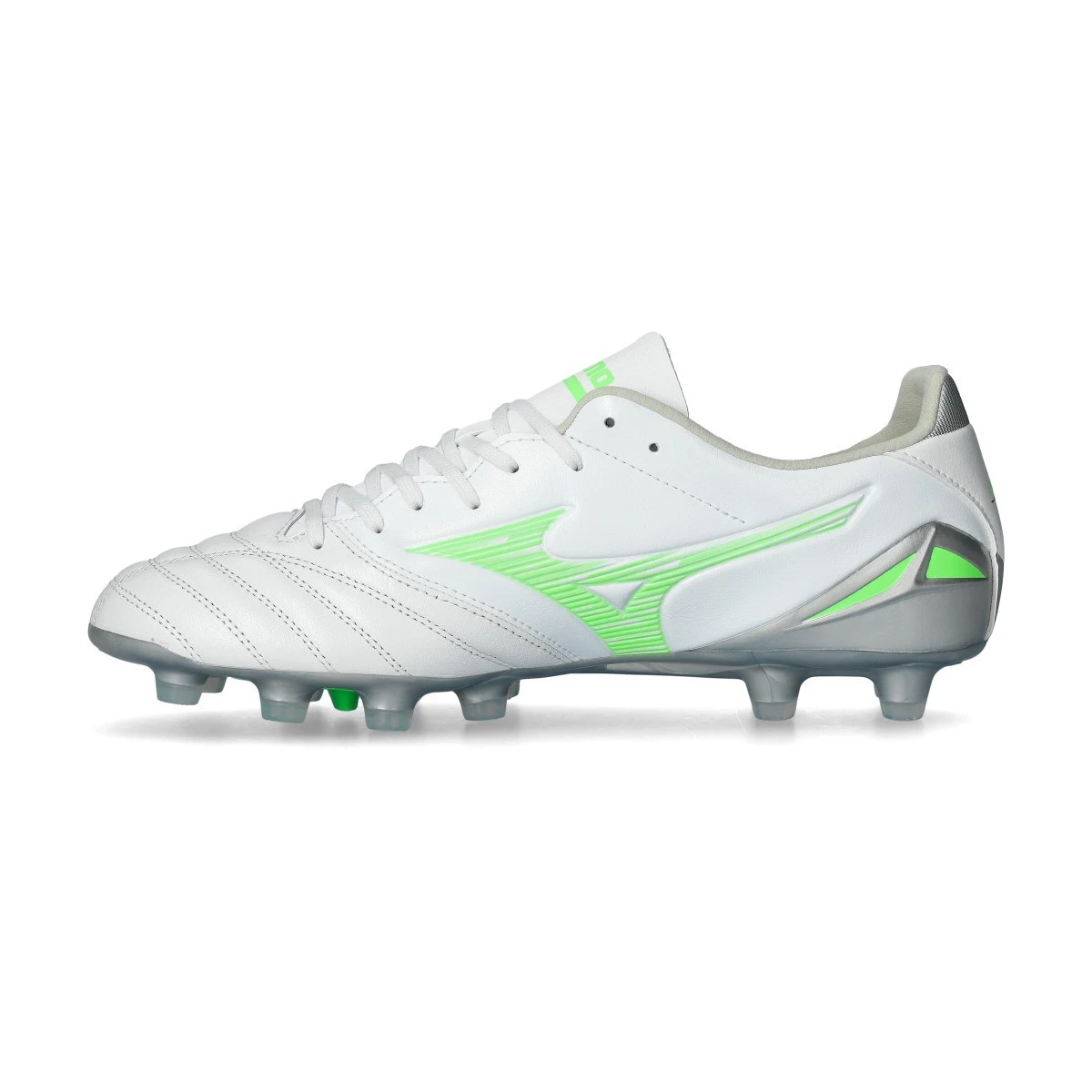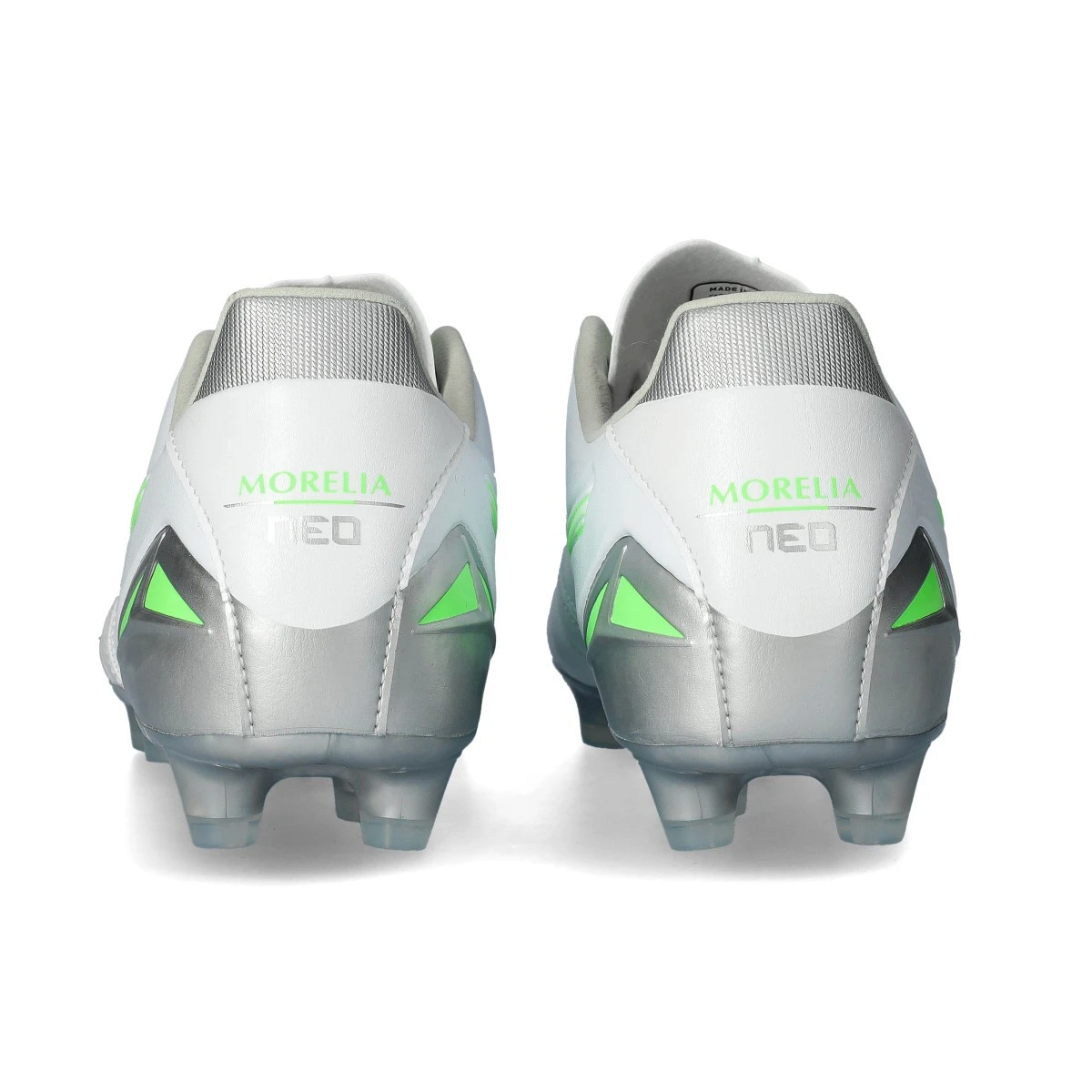 Chaussure Mizuno Morelia Neo IV Pro FG pour terrains en gazon naturel, en coloris White-Neon Green-Cool Gray.