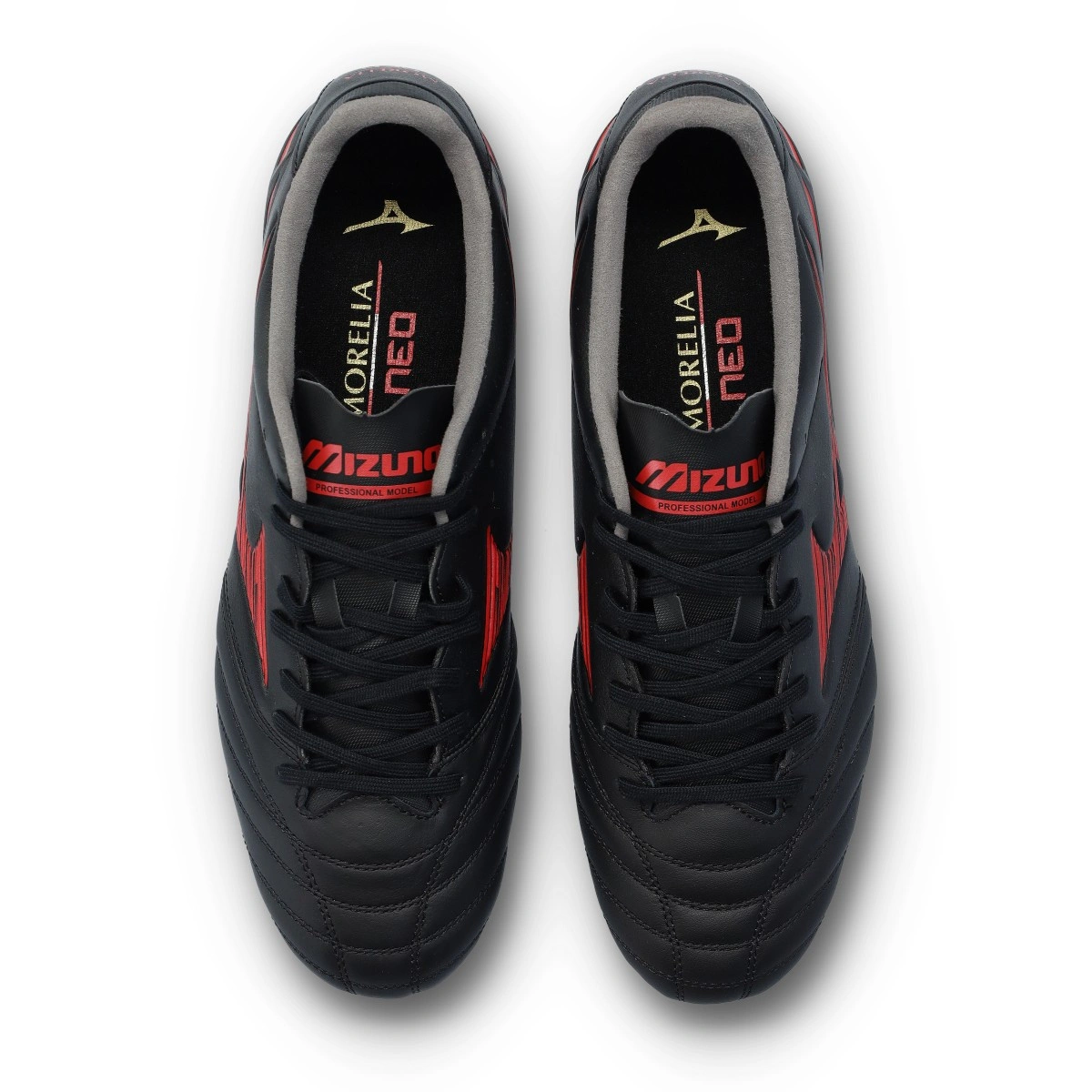 Chaussures Mizuno Morelia Neo IV Pro Mix. Pour terrains en gazon naturel humide, coloris Black-Red-Black.
