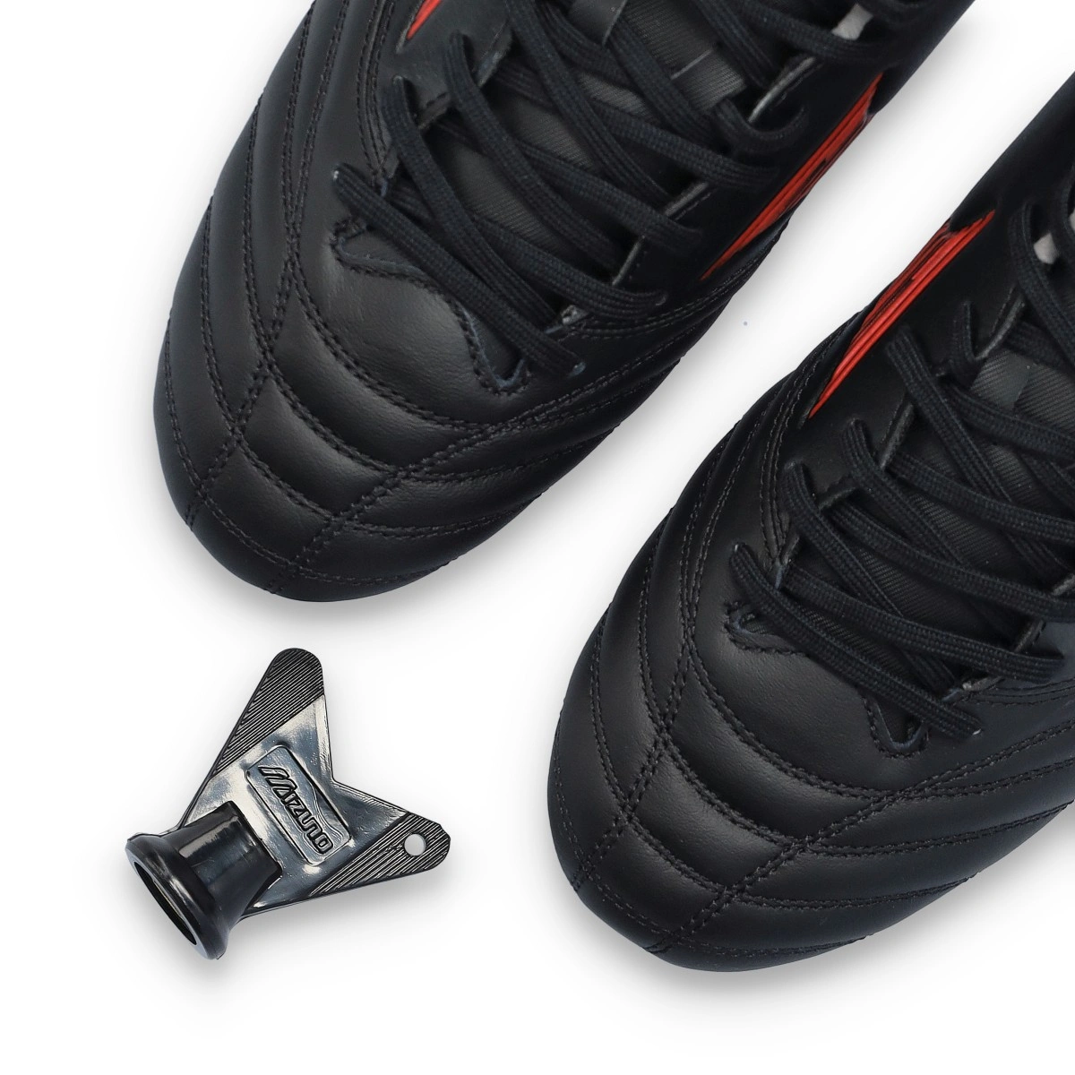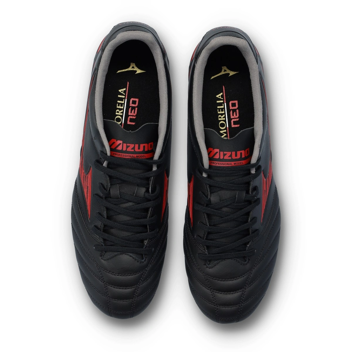 Chaussures Mizuno Morelia Neo IV Pro Mix. Pour terrains en gazon naturel humide, coloris Black-Red-Black.