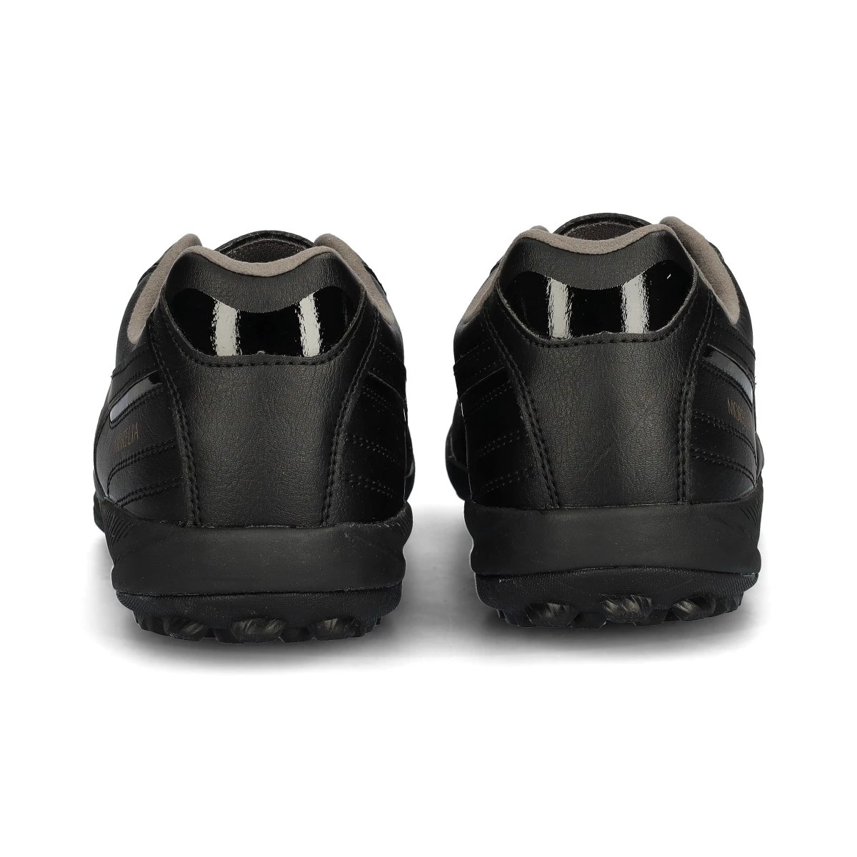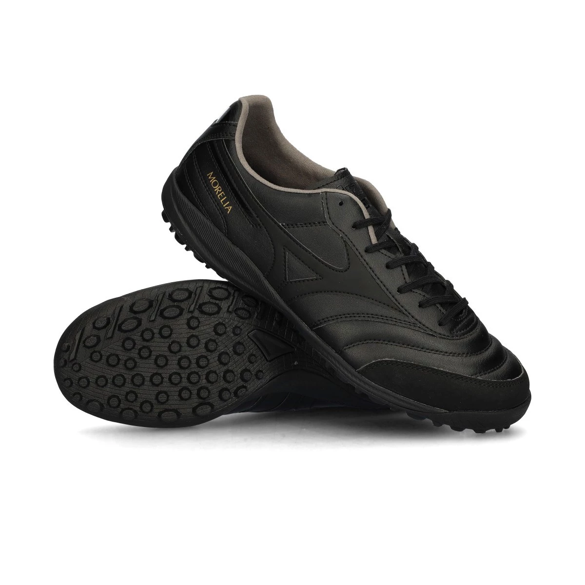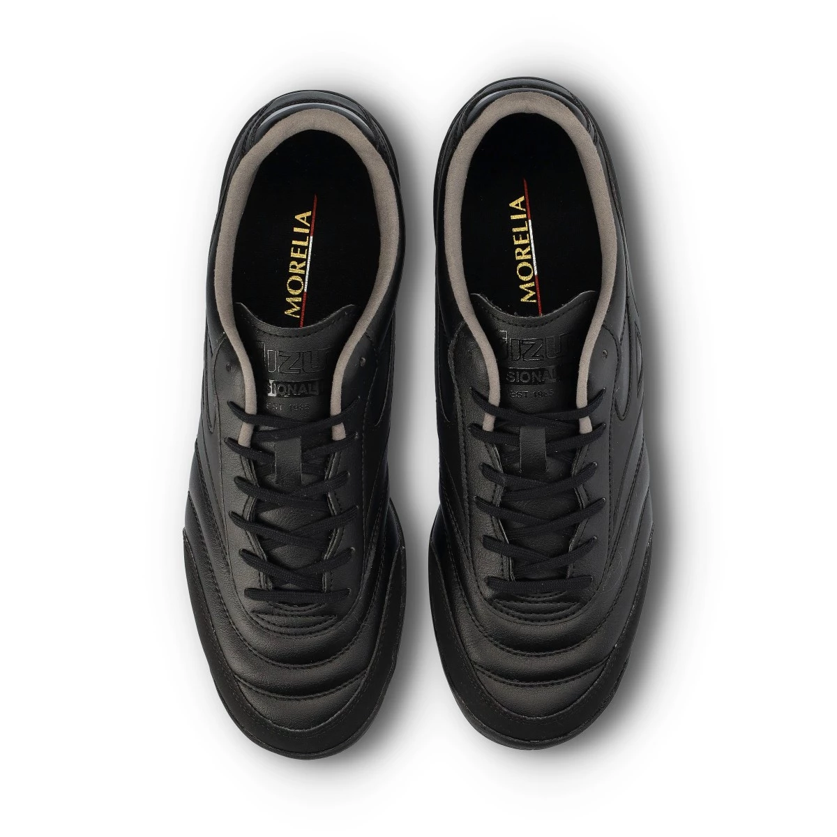 Chaussures de football Mizuno Morelia Sala Pro Turf en noir-noir-noir. Ces chaussures sont idéales pour les joueurs à la recherche d'un excellent ajustement et d'un bon amorti.