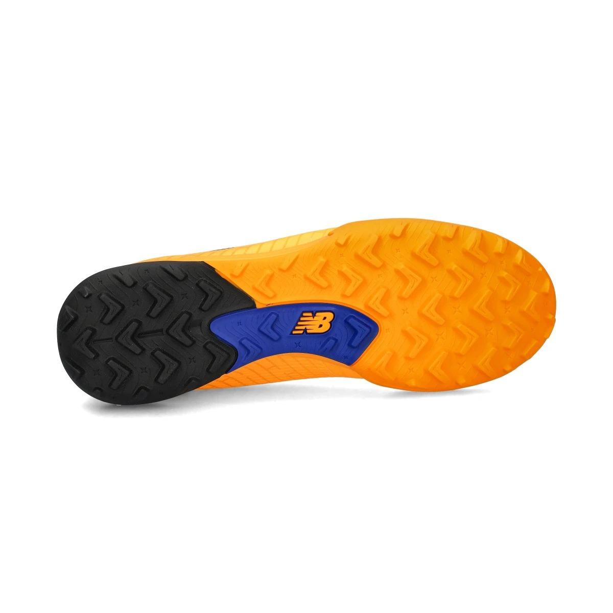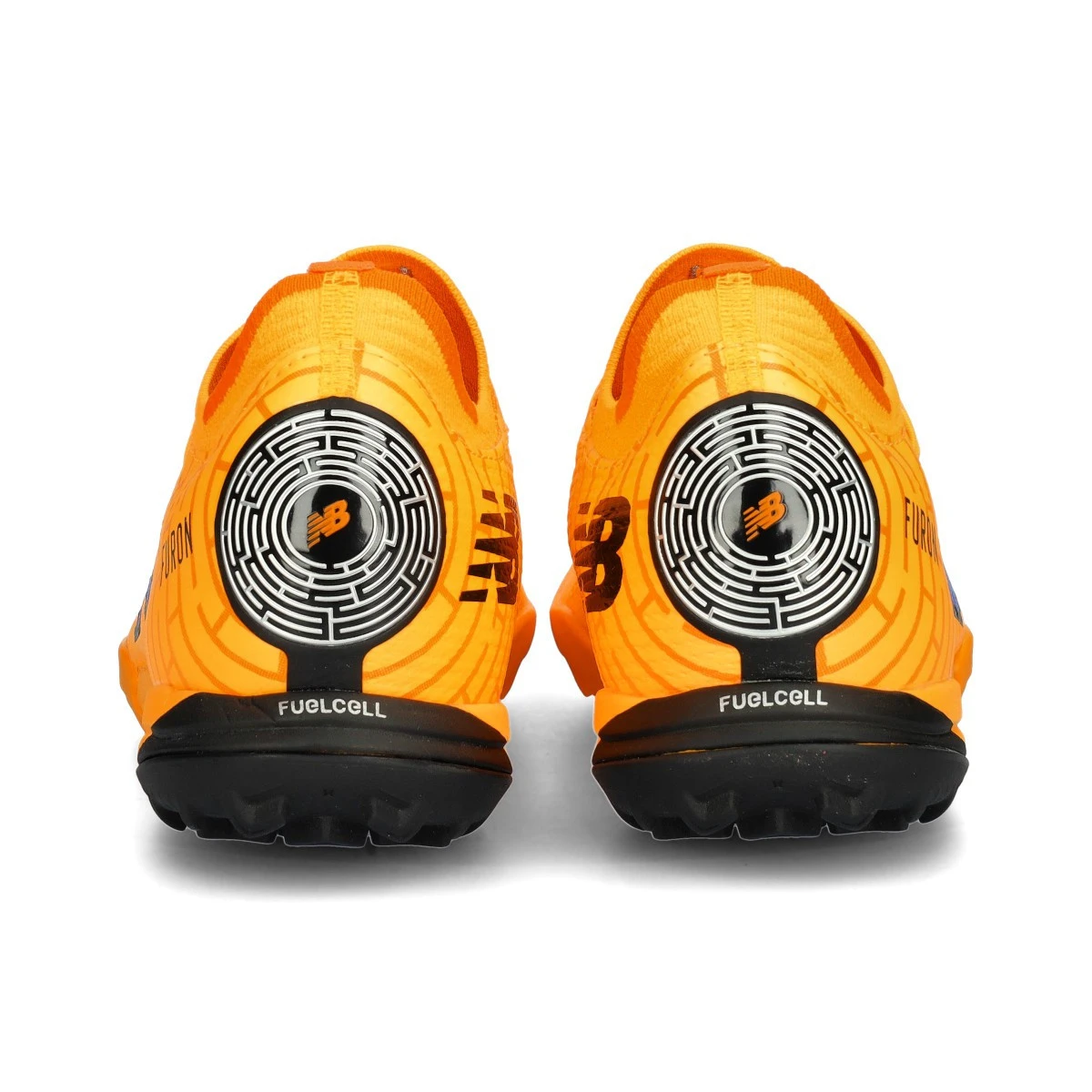 Chaussures de football New Balance Furon Pro Turf V7+ en Sun Glow-Silver Metallic-Black. Chaussures synthétiques à lacets pour utilisation sur terrains en gazon artificiel.