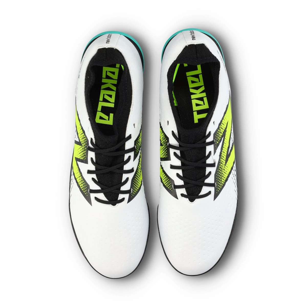 Chaussure New Balance Tekela Magique Turf V4+. Chaussure pour terrains en gazon artificiel. Tekela en White-Gold Met.-White.