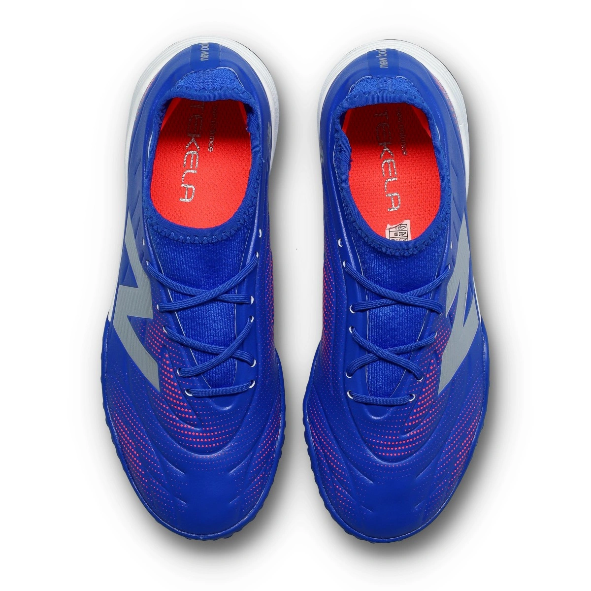 Chaussure de football New Balance Tekela Team Low Laced Turf V5 pour enfant. Chaussures en coloris Blue Gemstone, adaptées aux surfaces en moquette ou terrains en gazon synthétique.