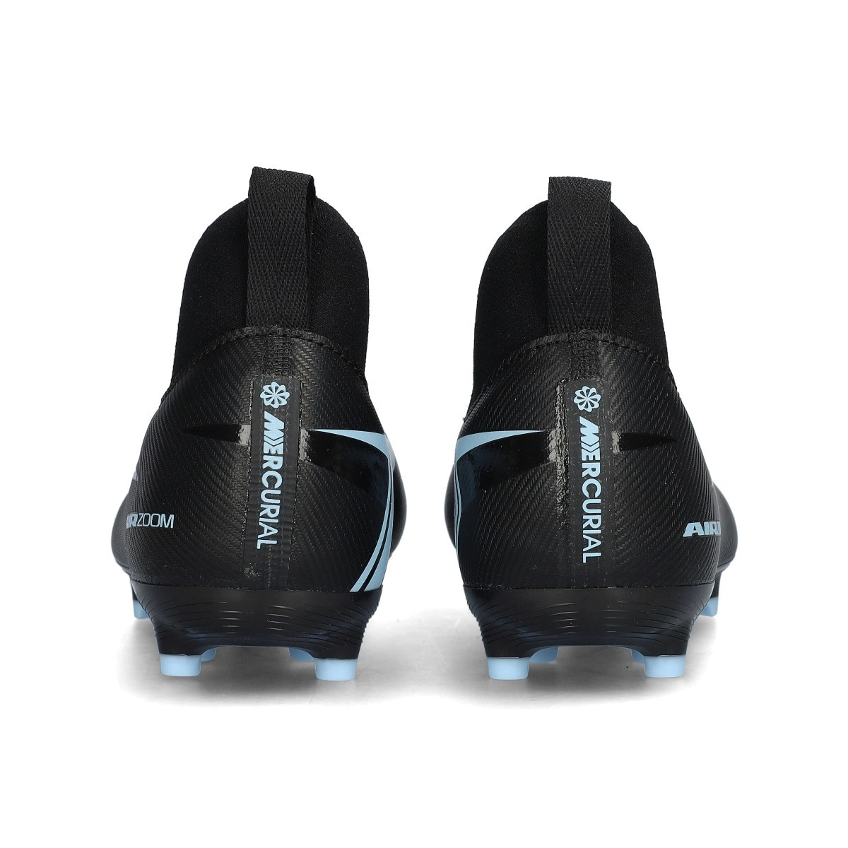 Chaussures Nike Air Zoom Mercurial Superfly 10 FG/MG Academy pour enfant. Chaussures en maille, conçues pour terrains en gazon naturel ou gazon artificiel de deuxième génération. Modèle d’entrée de gamme en coloris Black-Ice Blue.