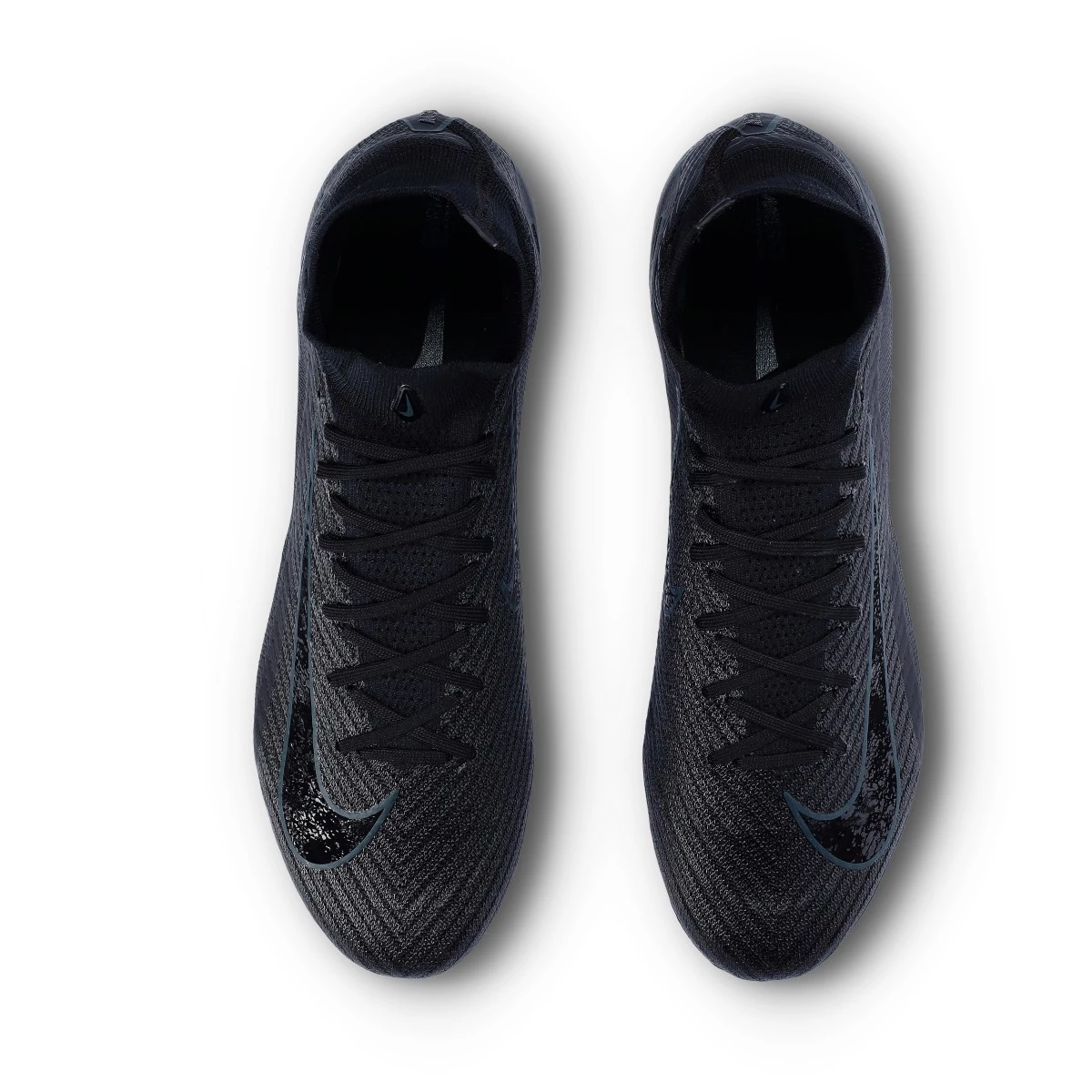 Chaussures de football Nike Air Zoom Mercurial Superfly 10 Elite FG. Chaussures en fil montantes, pour une utilisation sur les terrains en gazon naturel. Chaussures haut de gamme pour les joueurs rapides en Black-Black-Deep Jungle.